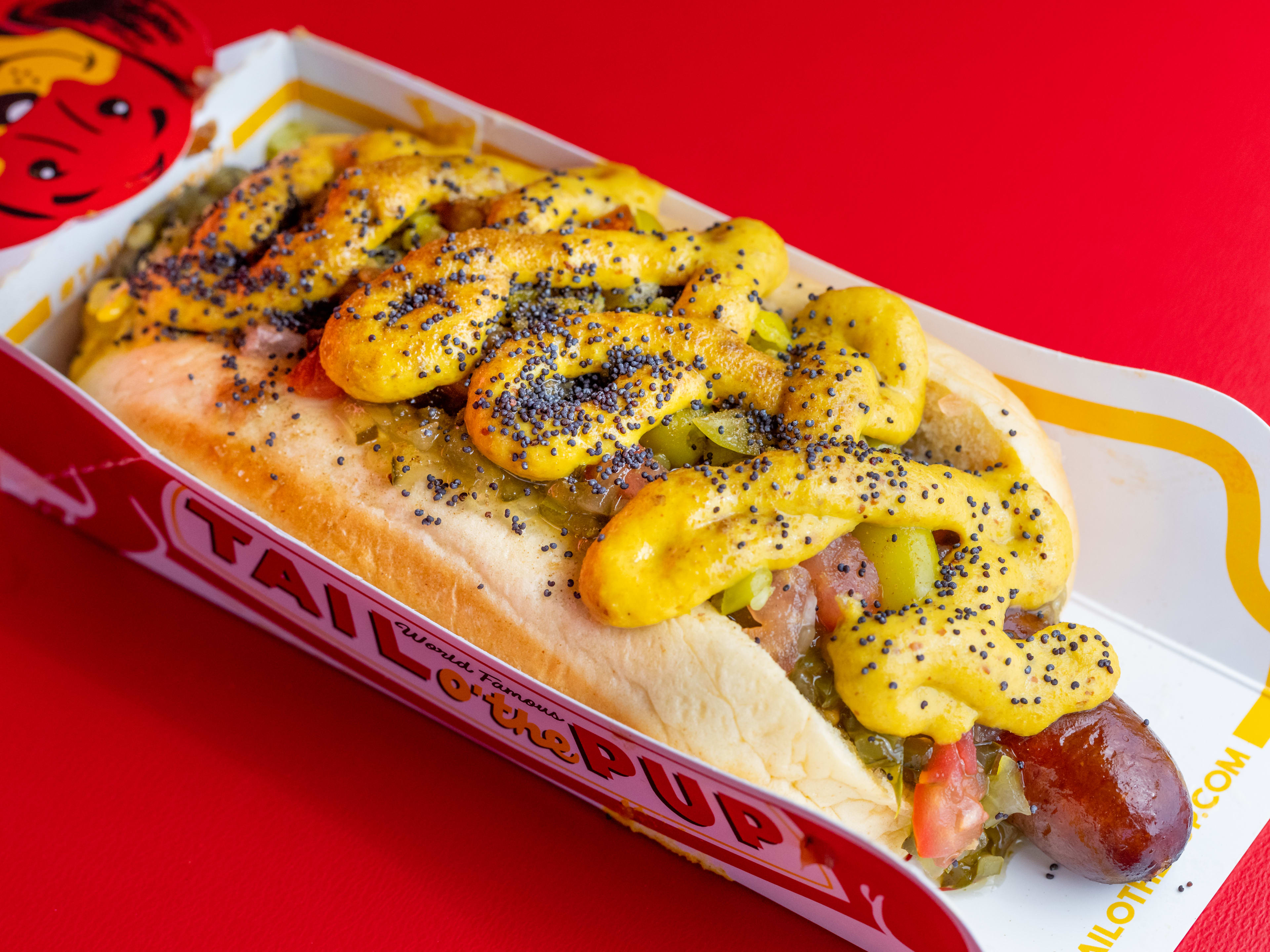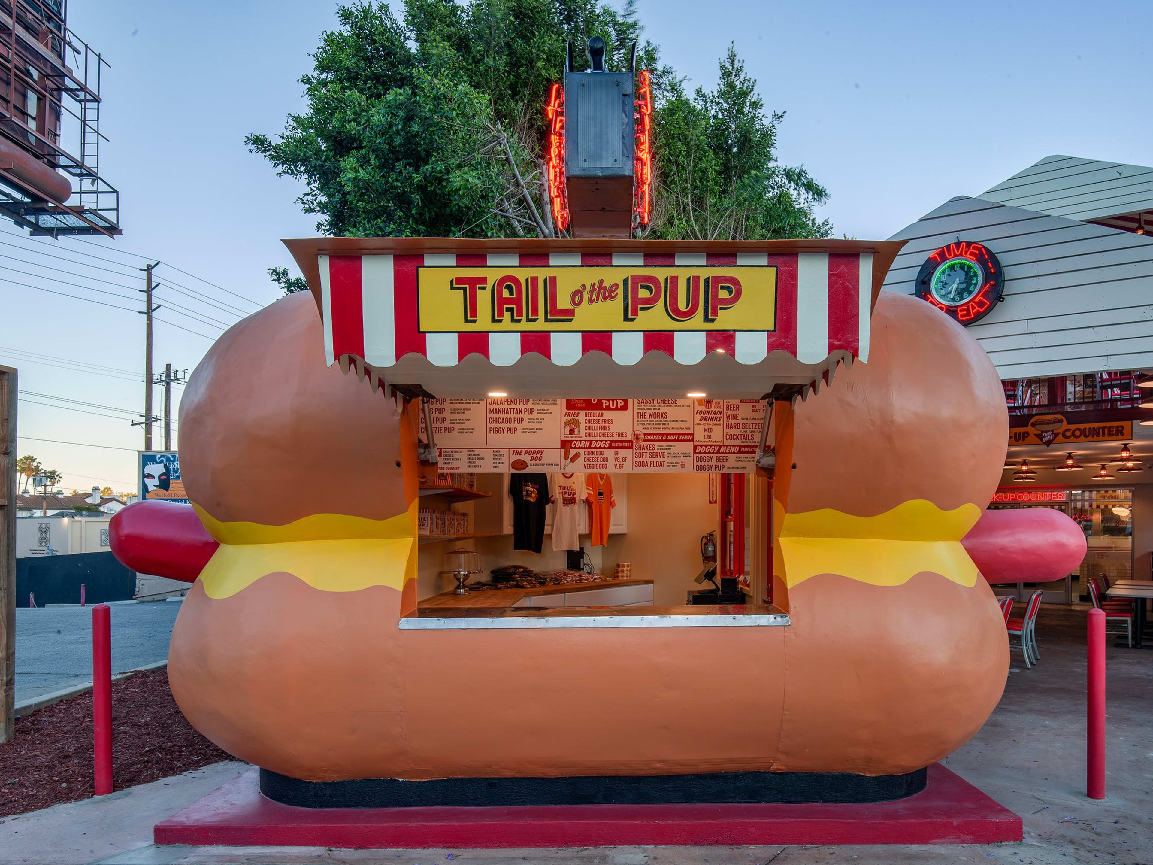 "An 18-foot stucco, hot-dog–shaped stand built in the streamline moderne style and opened after World War II in 1946, this spot quickly became an L.A. icon beloved by locals and celebrities and frequently appeared in film and television. After closing its ordering window in 2005 and spending years in storage, the sculptural dog was sympathetically restored by a preservation-focused hospitality team and relocated to a permanent site near San Vicente and Beverly, where an attached A-frame building now houses a kitchen and plentiful booth seating; the small building also once served as the studio where The Doors recorded L.A. Woman. The revived menu blends historic favorites — a 1946 split dog smothered with grilled onions and mustard and a simple 1976 steamed frank topped with ketchup and mustard (showcasing the distinctive Los Angeles “snap”) — with modern additions like gluten-free corn dogs, Coney Island–style vegan dogs, and soft-serve ice cream (including chocolate-dipped cones). Painstaking restoration preserved original hues and structural character, and the project is presented as a preservation-minded celebration of the city’s playful programmatic architecture and wacky, welcoming spirit." - Mae Hamilton
