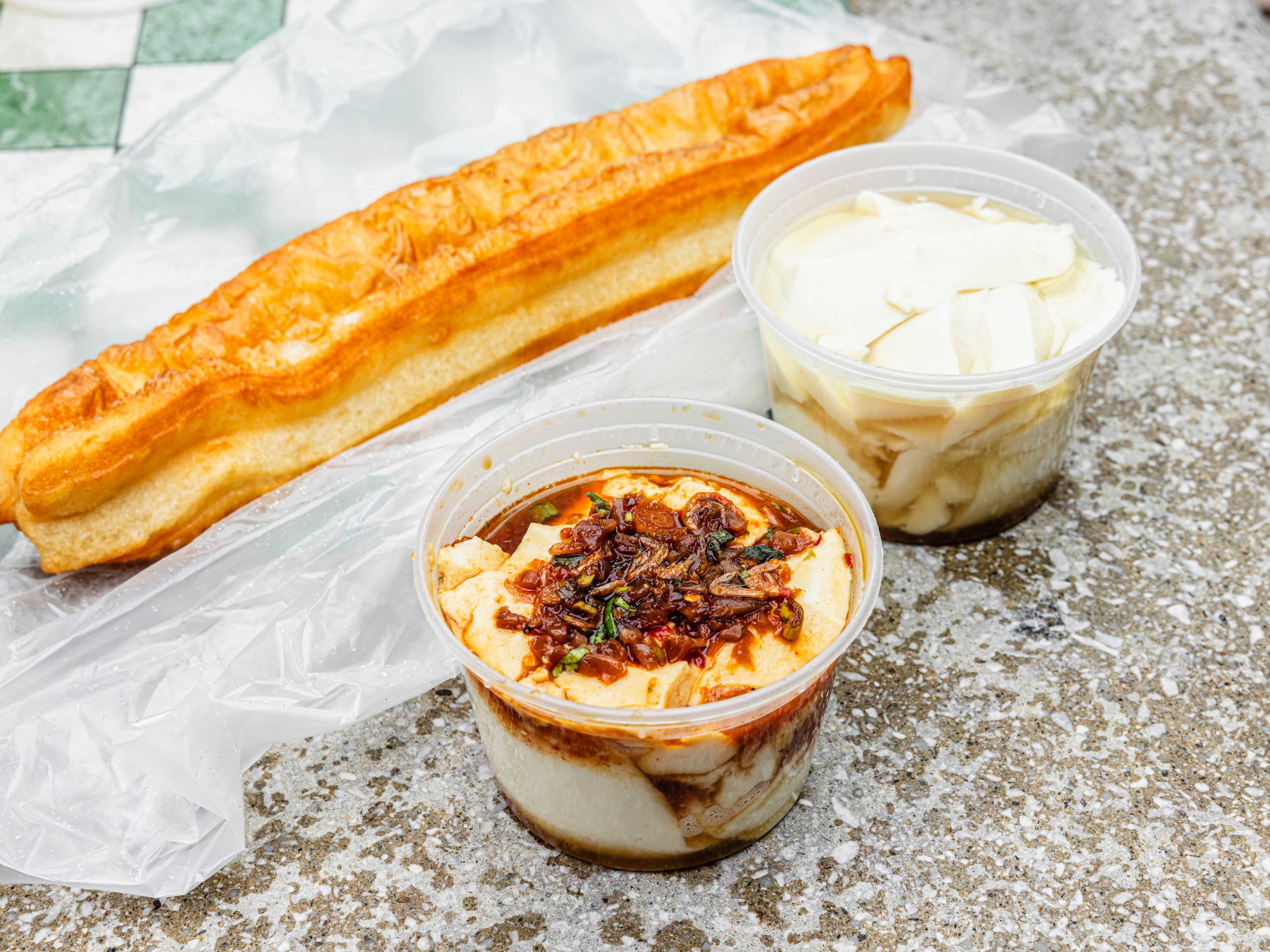 "Soy Bean Chan Flower Shop in Flushing, New York, is everything its name promises. Just inside a doorway flanked with bouquets of flowers for sale, customers line up at a small counter to purchase homemade soy products. The store’s most popular dish is a melt-in-your-mouth soft tofu pudding called dòu huā (豆花)—literally translating in Mandarin to “bean flower.” The pudding can be either sweet or savory, eaten with a ginger-flavored sugar syrup or a savory sauce made with chili peppers and tiny shrimp. Mr. Chan, who has been making the pudding for more than two decades, scoops it out of a rice cooker into containers for each customer. The store also sells fresh soy milk alongside its traditional counterpart, yóu tiáo (油条). The long strips of golden fried dough rest on top of each other in a large rectangular box on the counter. Other quick bites like steamed buns are visible through a small arched opening in the front window. Further inside the store, there are small sculptures, bouquets, and plants, crowding narrow aisles. The greenery is contrasted by decorations in red, the color of prosperity. Large lanterns hang from the ceiling. Red ribbons are tied around plants. A smiling Buddha faces the doorway, greeting those who pass by on Roosevelt Avenue. Know Before You Go The shop only takes cash, for both flowers and the food." - Ilena Peng
