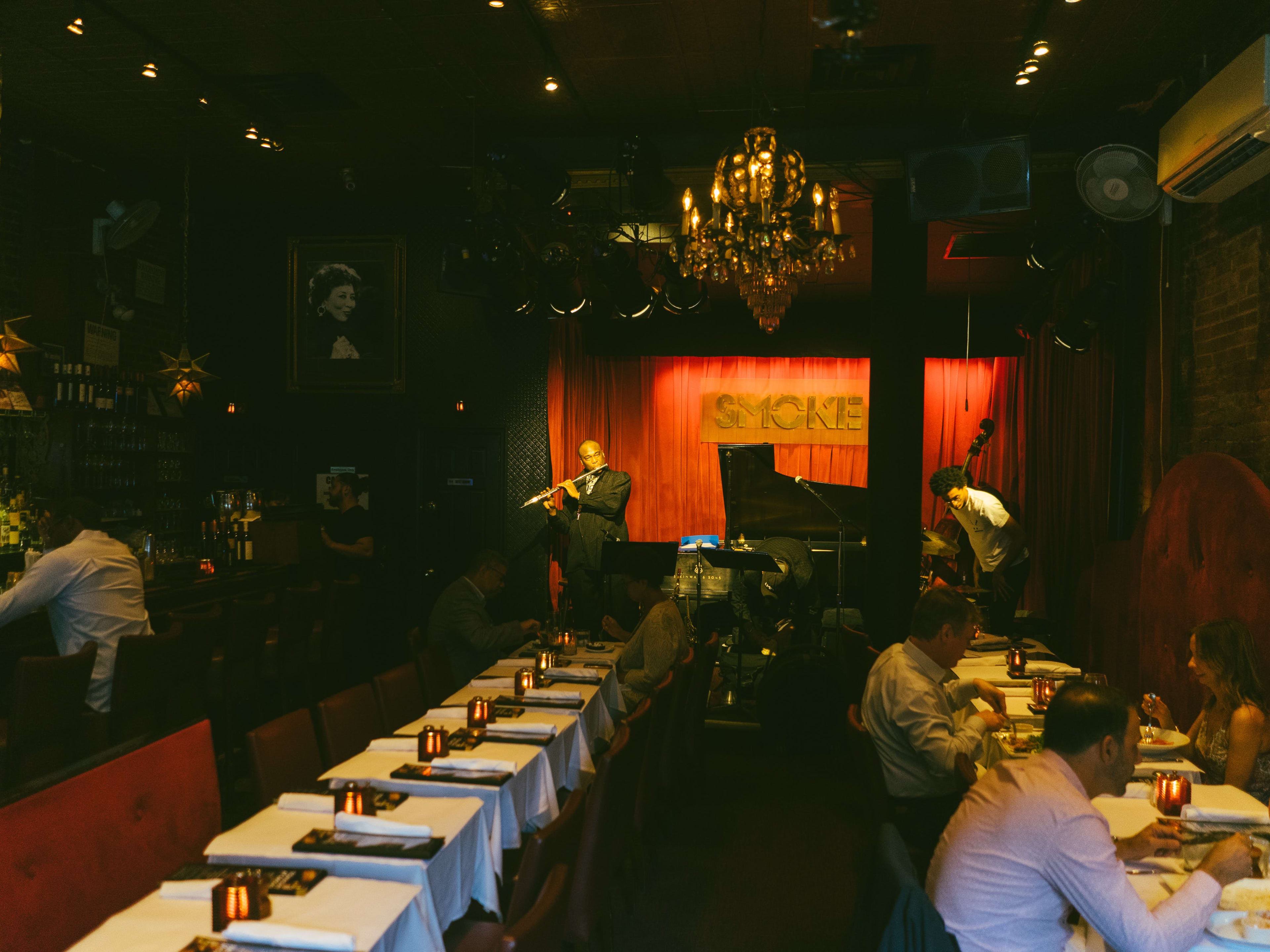 "We find Smoke's exposed brick, moody red curtains, and onstage baby grand perfect for a dinner-and-a-show evening of jazz, blues, and Latin music between 105th and 106th; the soft lighting makes it a cozy, intimate spot." - Madison Flager, Kat Chen