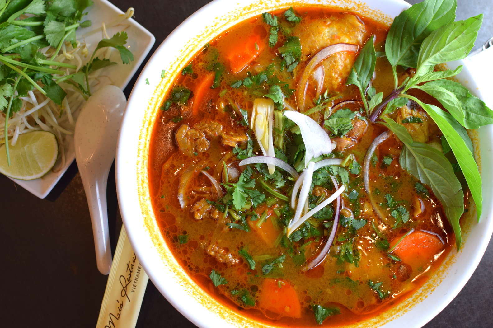 "order the crispy egg rolls, pho, bun bo Hue spicy beef noodle soup, or the Mai’s signature bo luc lac garlic beef, and wash it all down with strong and sweet cafe sua da Vietnamese iced coffee"