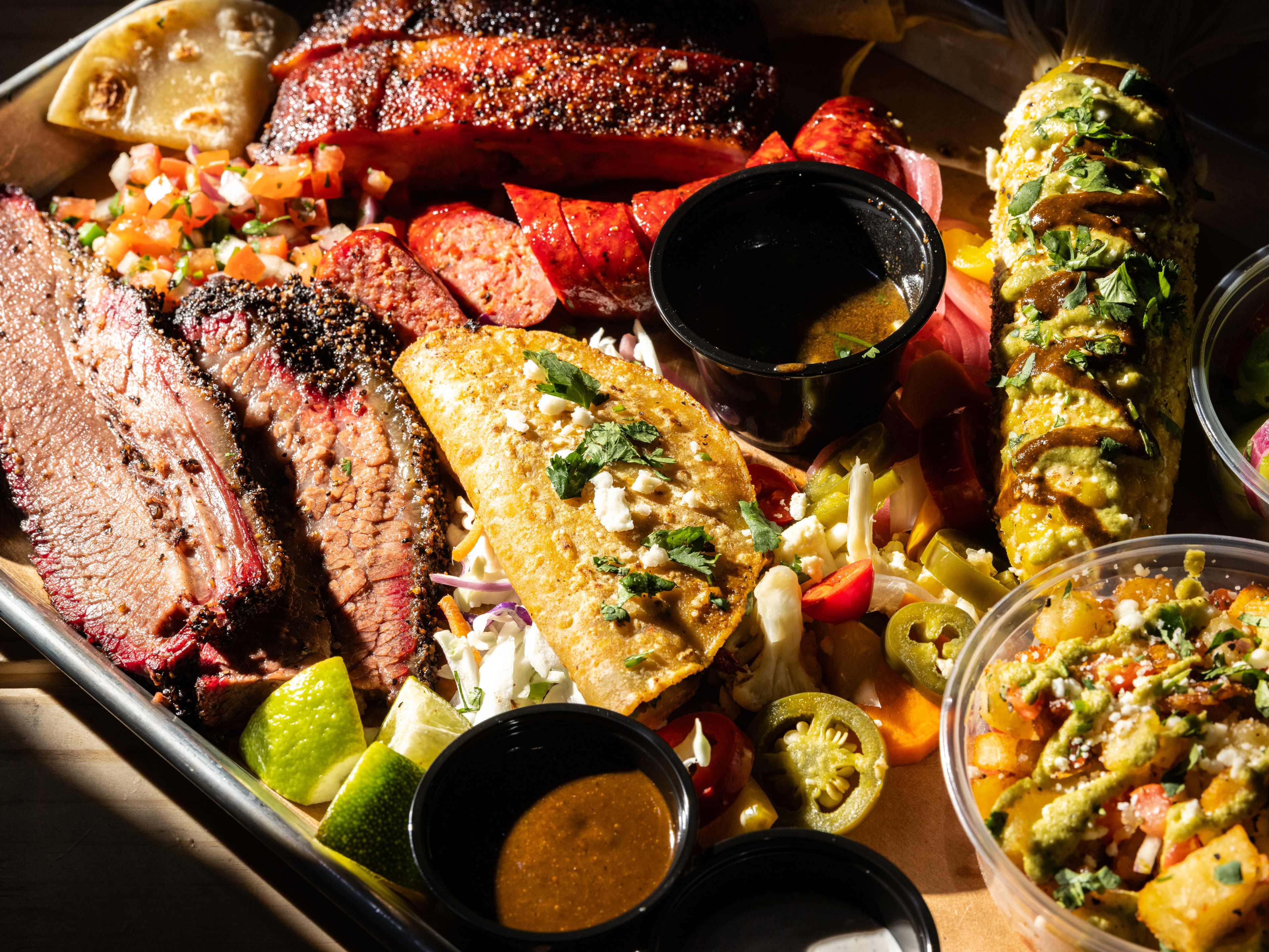 "Arnulfo “Trey” Sánchez has created one of the coolest pit rooms in the state of Texas. His cookers are custom-painted, as is his smoker, and they’re all visible through a big window from outside. If you ask, he just might take you on a tour of the closed-in room. Diners won’t smell smoke wafting out of Vaqueros, however, because it lives at the bottom of a commercial office building in a shopping mall — a true rarity that means the smoke from the pit room has to be cleaned and recycled, and can’t escape. Don’t let that fool you: this place sells killer quesabirria tacos stuffed with salty brisket, pork belly with a crispy outside and soft interior served in a thick salsa, and corn on the cob with the husk still on that is some of the most incredible at any barbecue joint in the Metroplex. Sánchez is from a family legacy of barbecuers, and their story in barbecue and Mexican food can be seen on the giant mural in the Vaqueros dining room." - Courtney E. Smith