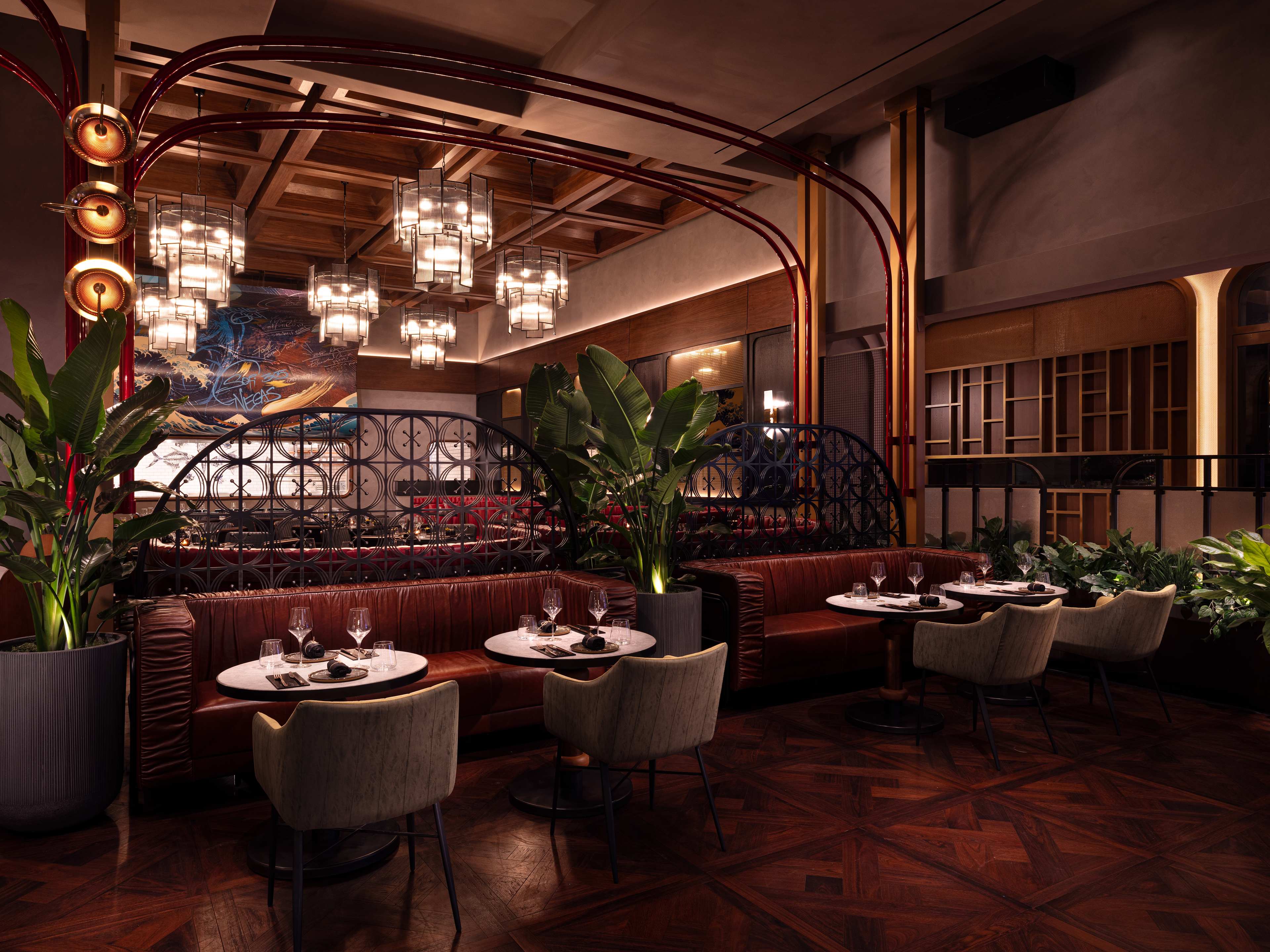 Neon-lit lounge with romantic booths, fruity cocktails & reflection pool