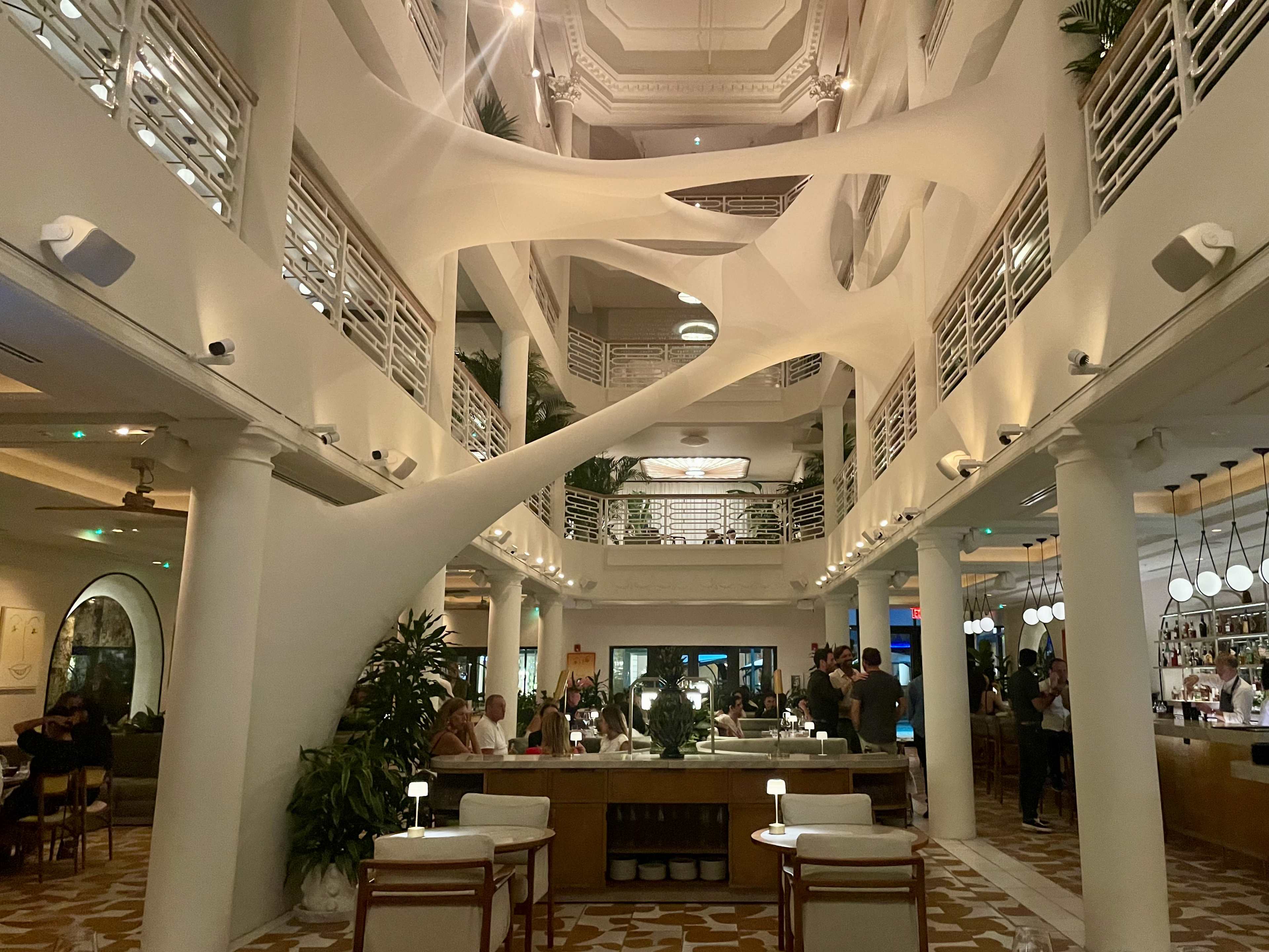 "Located inside the historic Moore Building in the Miami Design District, the restaurant’s centerpiece is Zaha Hadid’s dramatic sculpture — a web-like structure commissioned for Design Miami’s 2005 debut — which stretches across a light-filled four-story atrium. The space thoughtfully mixes old and new, with neoclassical architecture complementing Brazilian wood furniture, velvet banquettes, and contemporary art curated by Monica Kalpakian. Chef Joe Anthony’s seasonal American menu, featuring dishes like citrus-cured kingfish crudo and bison tartare, ensures the food lives up to its striking surroundings. It’s a restaurant where smart design elevates, rather than upstages, the dining experience." - Olee Fowler