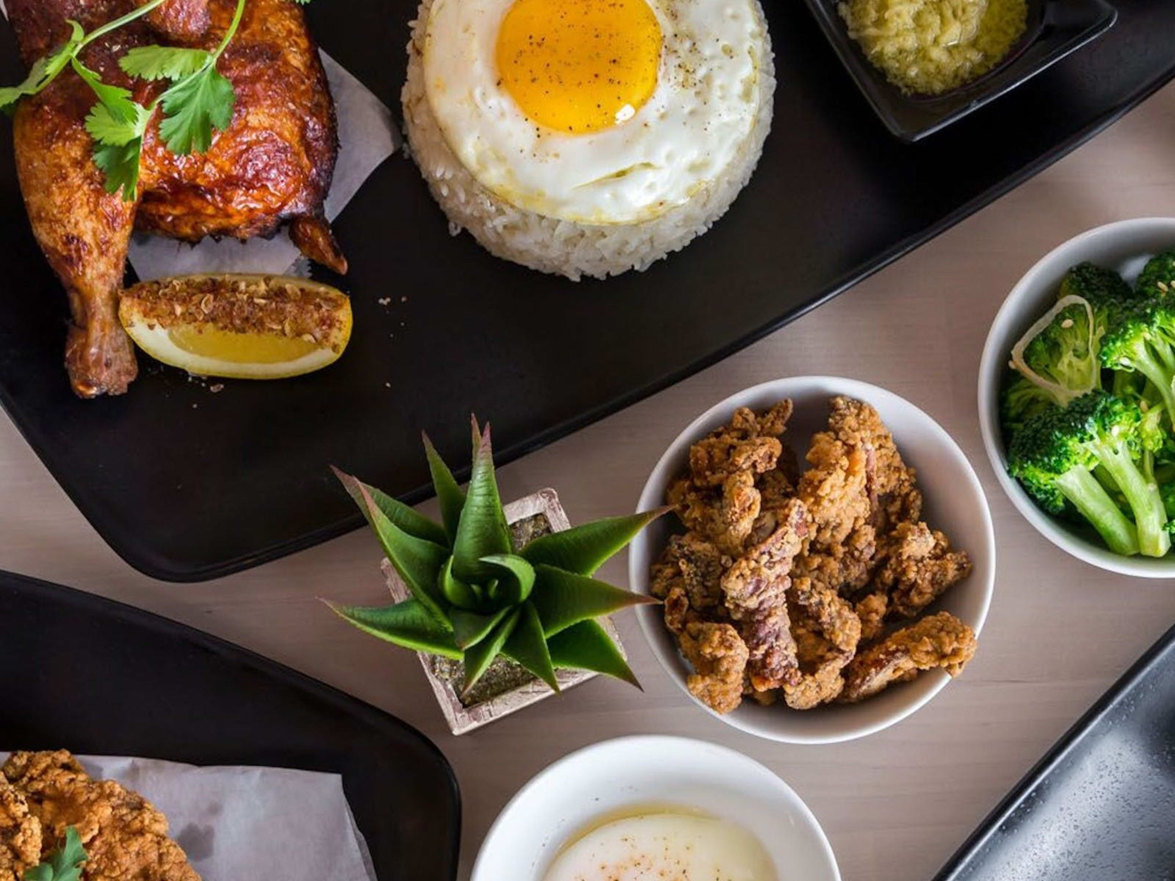 Hawaiian fare & rotisserie chicken in airy room with Victorian decor