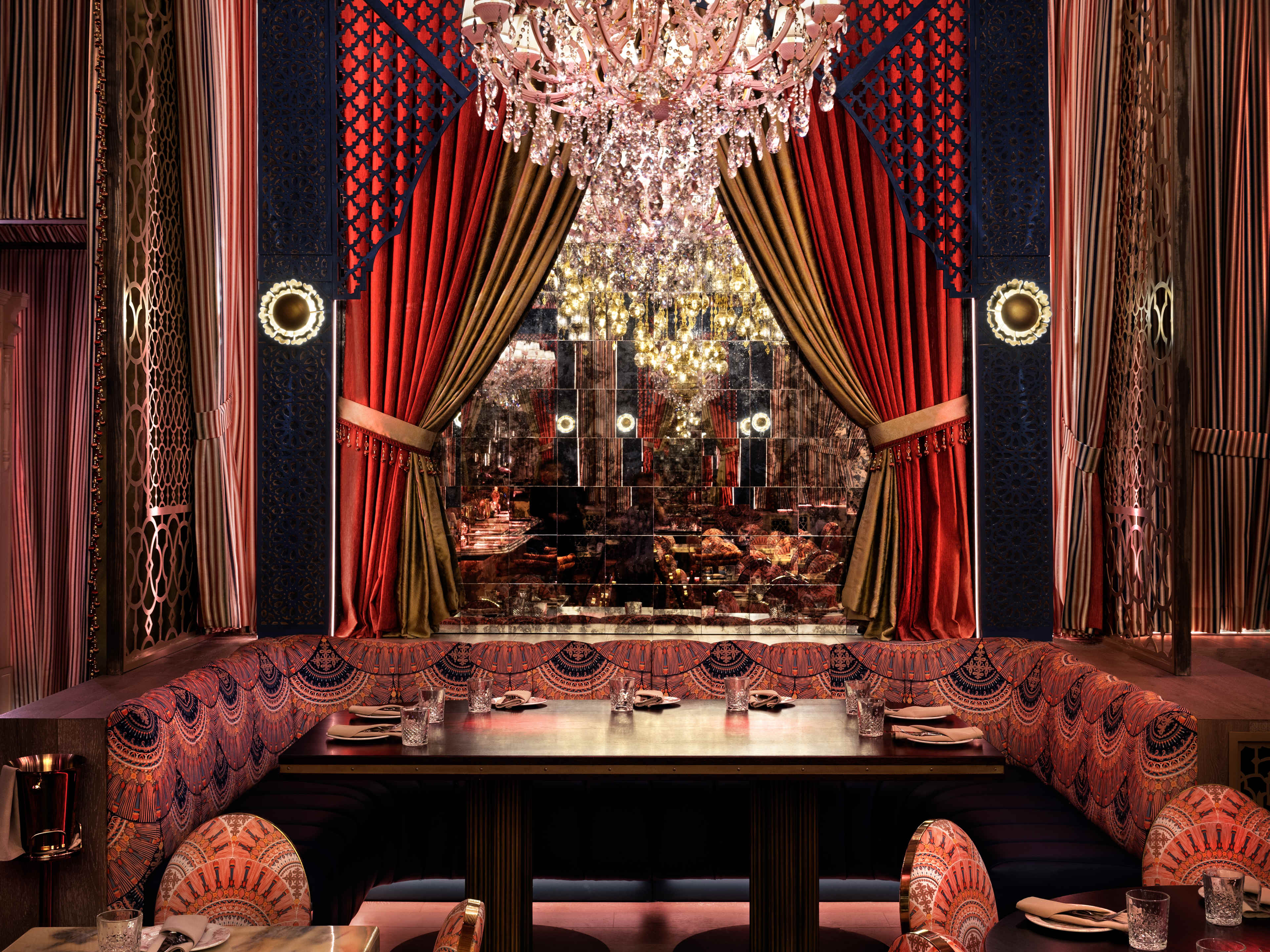 "I visited the city’s latest riverfront restaurant, Habibi Miami, which serves French-Moroccan cuisine alongside live entertainment; hospitality vet Roman Jones has tapped Ikam Rebaia to bring his over-the-top flair to this lively new space. The menu blends Middle Eastern flavors and American shareable fare—standouts include merguez pigs in a blanket and a whole roasted cauliflower with charred wild mushrooms; familiar bites include wagyu burger sliders and miso-honey glazed sea bass skewers, and there’s also sushi and a variety of other shareable plates. For dessert, expect tableside service with Turkish mastic ice cream and halva cheesecake. The bar program draws on North African and Mediterranean traditions and uses techniques like fat-washing to infuse spirits, showcased in drinks such as the Ali Fashioned (peanut butter-washed bourbon with banana and honey) and the Moroccan Margarita made with harissa-infused pineapple and a roasted couscous–salted rim. Designed by Mark Lehmkuhl of Ghosthouse Design Group, the tent-like space nods to Moorish architecture and evokes a Moroccan riad with retro pink-and-teal 1960s Tangier touches; a dramatic 30-foot red carpet leads into a dining room with crystal chandeliers, velvet booths, and silk draperies, with a spacious patio outside and tableside hookah service with custom infusions. Nights are lively with belly dancers, percussionists, and roving performers." - Olee Fowler