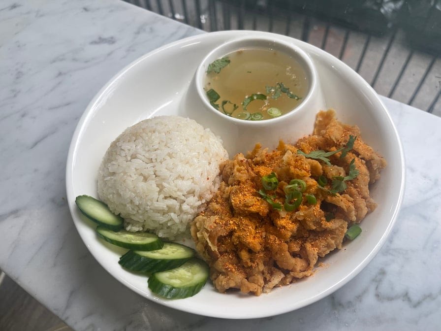 "I was recently delighted to find a new provider in Greenwich Village tucked into a small walk-up space that used to be an oatmeal café; Me Chicken Rice’s refreshingly limited menu is top notch. The khao mun gai ($12), conveniently sliced for easy eating, is gingery, and the rice comes with chicken livers and gizzards, which I love. A chile sauce on the side provides compulsory dipping for every morsel of chicken, and there’s a cup of broth you can regard as a warm beverage or dump over the rice for extra flavor. The name makes it hard to Google, but the food is worth seeking out." - Robert Sietsema