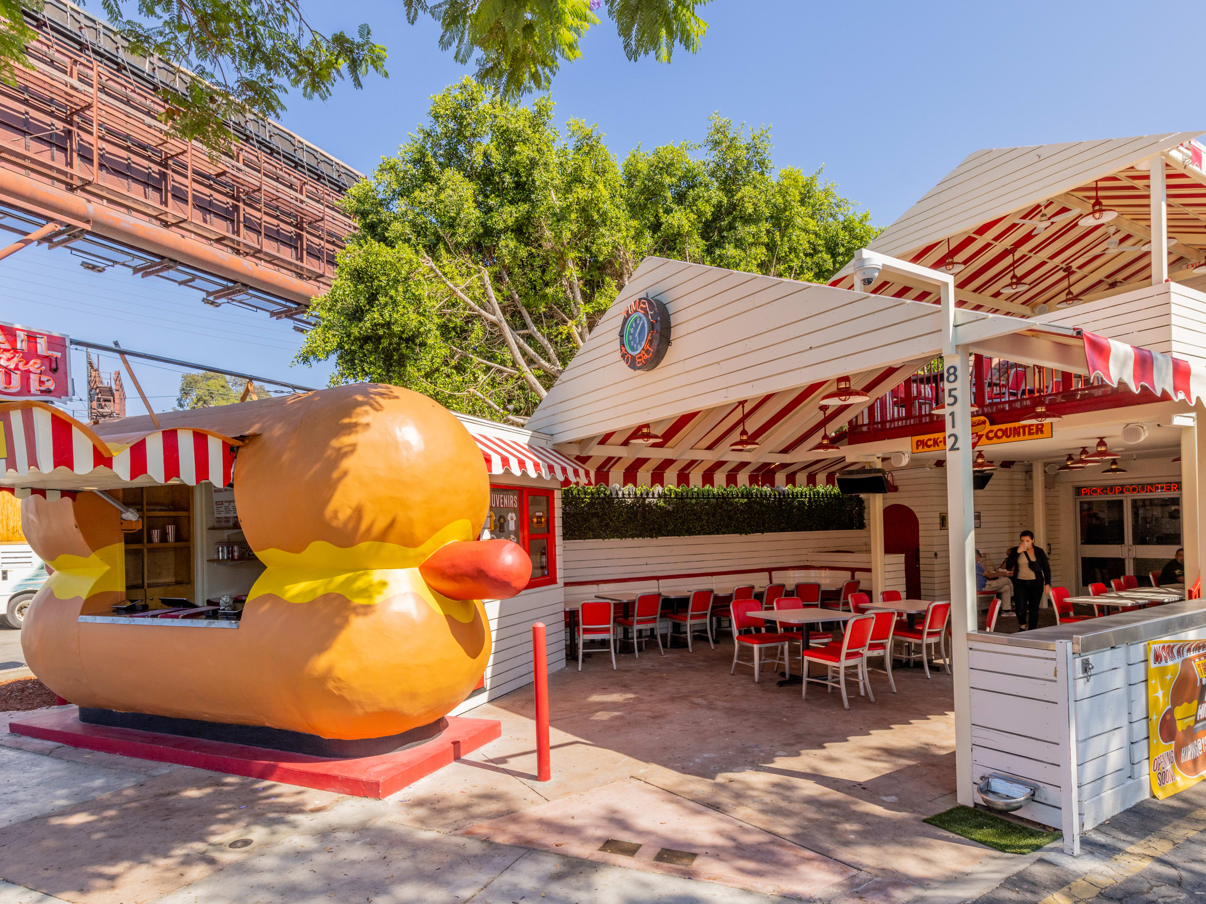 "After closing nearly a decade ago, the legendary Tail o’ the Pup was restored in a prime West Hollywood location, complete with a hot dog-shaped stand, red and white streamers, and mustard yellow accents. The dogs range from the split and grilled 1946 (topped with grilled onions and house mustard) to chili-slathered to the footlong Baseball dog adorned with house mustard and sweet relish. The menu is also inclusive: vegetarian and gluten-free options abound." - Eater Staff