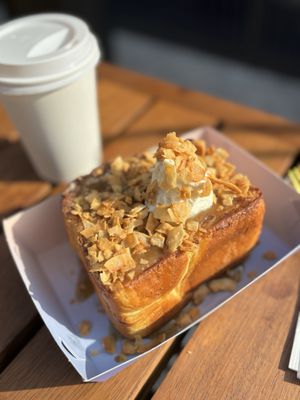 Colossal brioche French toast with peanut butter coconut maple syrup