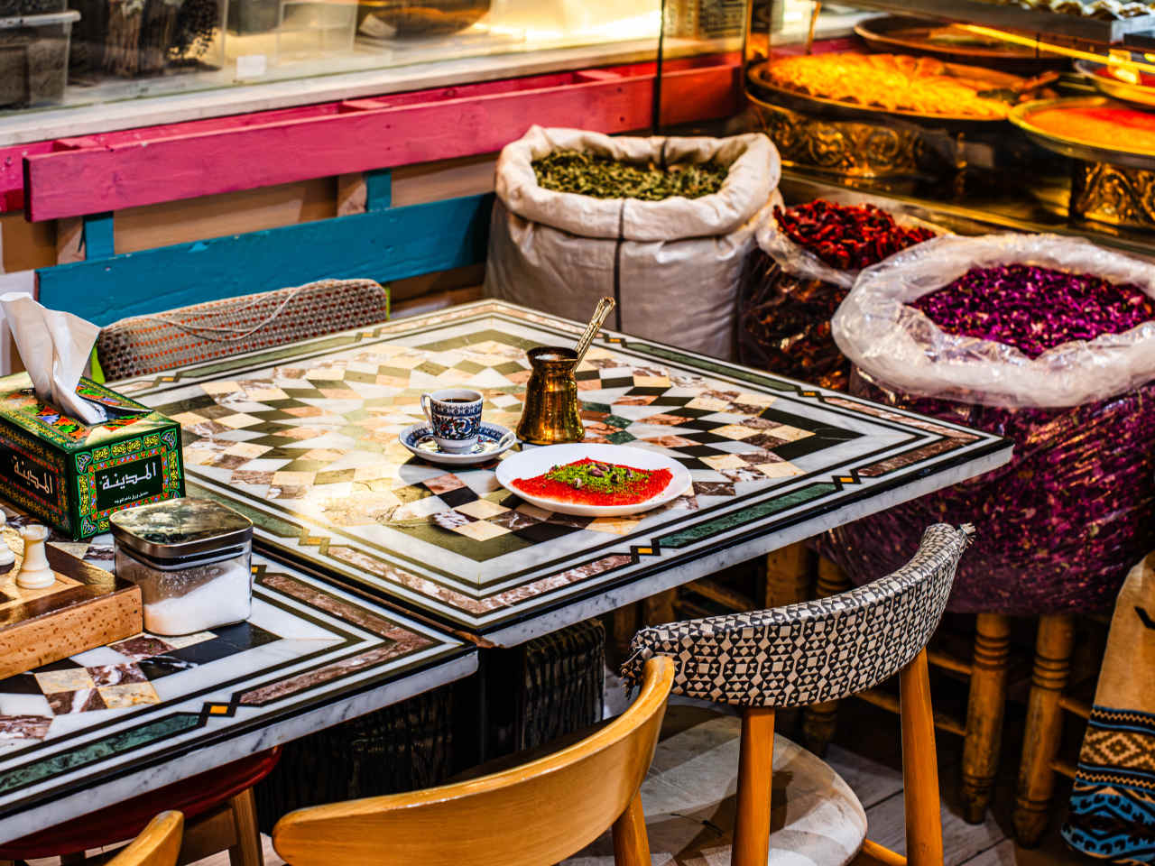 "Levant Book Cafe is open from 12pm to 12am everyday, but it really comes to life in the evening. This Syrian spot in Park Royal has trays of baklava and bright orange kunafa whatever the hour, books lining the walls, and what seems like a never-ending supply of strong, steaming Arabic coffee. Wooden chessboards are on every other table inside, and outside on the covered, heated terrace, groups of friends fight for bites of the stringy, cheesy kunafa, and a live band might be playing depending on the weekend. Come for a cup of coffee, to peruse the Arabic books, or just to hang out by one of the fountains when all the other coffee shops are closed and you don’t want the night to end. photo credit: Aleksandra Boruch photo credit: Aleksandra Boruch photo credit: Aleksandra Boruch photo credit: Aleksandra Boruch photo credit: Aleksandra Boruch Pause Unmute" - Rianne Shlebak
