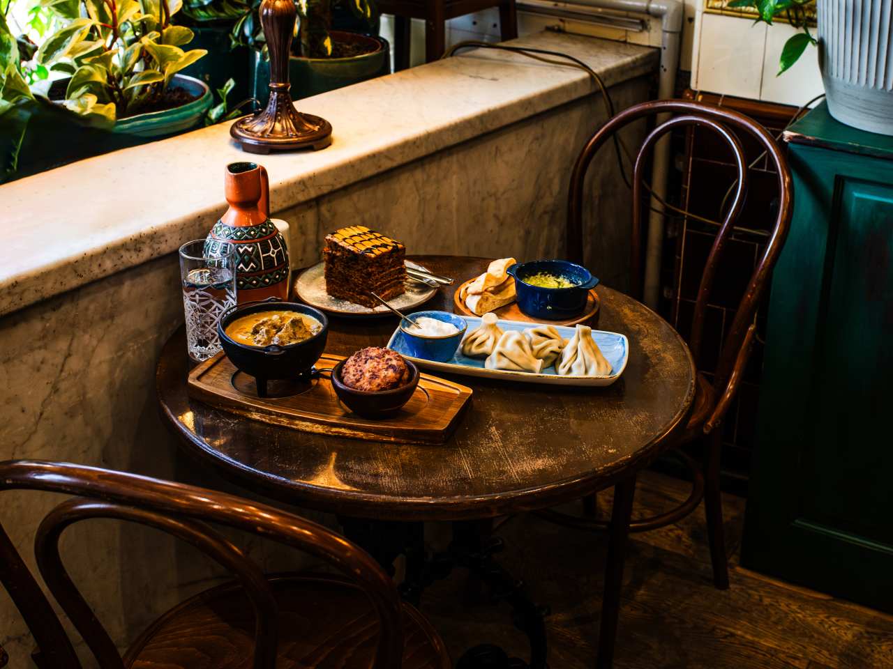 "Kartuli could easily be the home of a bohemian author. One with a vintage gramophone and a panduri—a Georgian string instrument—hanging from the wall, waiting to be strummed after everyone has sunk a few bottles of wine from the heaving shelves. It’s all very cool in a way that makes you want to take a European holiday, day drink, laugh loudly, and talk about art. East Dulwich locals pour in every night of the week, pulling up chairs beneath hanging foliage and settling in for long, lingering meals. The Georgian food is excellent and this combination has never let us down: tashmijabi to start, megruli kharcho for mains, and chvishtari for some extra carbs that aren’t necessary but are delightful. photo credit: Aleksandra Boruch photo credit: Aleksandra Boruch photo credit: Aleksandra Boruch photo credit: Aleksandra Boruch Pause Unmute Food Rundown Tashmijabi Potato, milk, and cheese come together here in one beige-carb-comforting trio to create a gooey, fondue-like pot in which you dip shoti bread. It’s as fun and soothing as it sounds. We like the slightly spicy, herby green ajika sauce that’s swirled on top—it does wonders to stop dairy fatigue from setting in. photo credit: Aleksandra Boruch Megruli Kharcho The beef gets the memo here—dutifully falling apart so that you barely have to chew it. But the stew is the real star. It’s creamy and glossy, with warming spices and a satisfying, thick consistency that coats all the meat. photo credit: Aleksandra Boruch Mushroom Khinkali These mushroom khinkali are some of the best we’ve had, and we’d choose them over the meat ones. The dumplings themselves are delicately pleated and not too thick. The mushrooms aren’t soggy at all and they’ve been cut so finely that they become more of a compact, meat-like filling. photo credit: Aleksandra Boruch Chvishtari It’s cornbread with cheese, but in the same way that a puppy is just an animal. Really it’s a close-textured, puck-shaped patty of goodness and comfort. It’s solid enough to dunk into stew without falling apart, and we like the sweet-salty balance. photo credit: Aleksandra Boruch Honey Cake This honey cake is tasty, in the way that caramel cream and drizzles of dark chocolate are always going to be good. But we do find the sponge layers to be a bit dry. photo credit: Aleksandra Boruch" - Sinéad Cranna