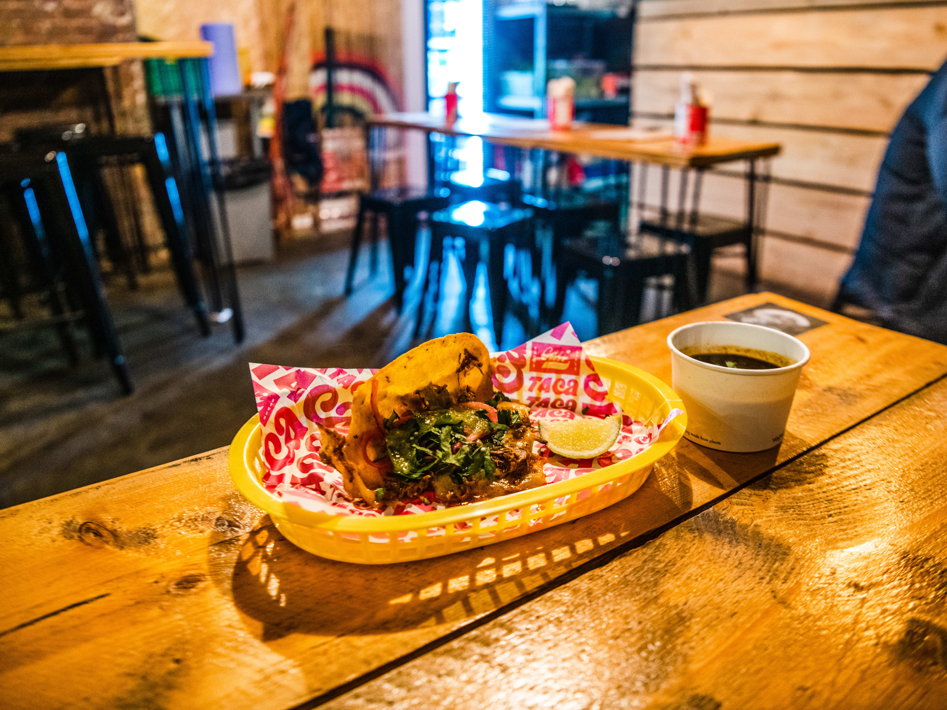 "If every train station in London was next to a pink and yellow neon sign with the words, TACO KITCHEN on it, the world would probably be a better place. Taca Tacos is a cosy, little spot bringing some of that sunny, California energy to the arches of Deptford’s Market Yard. The meats are all slow-cooked, fall-apart, and comforting, but the seats are not, making it suited to a quick taco pit stop. Snag one of the four inside tables midweek, and make a mess of your chicken pibil in peace. Or come on the weekend, when big shared tables outside fill up with groups, sitting under twinkling fairy lights, dunking corn tortillas into a six-hour beef birria broth. " - rianne shlebak, jake missing, sinead cranna, daisy meager