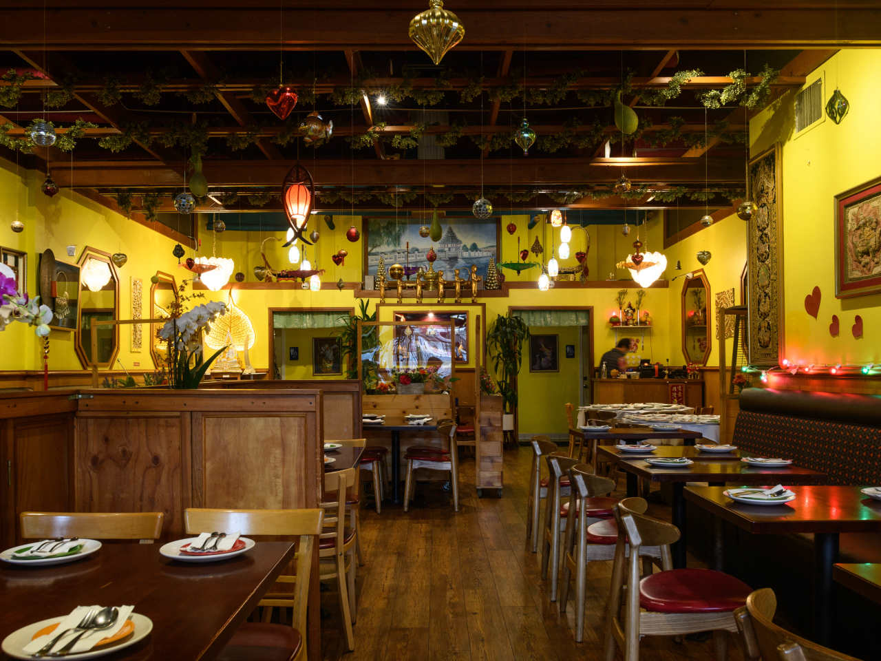"So you just got into a screaming match with your neighbor over what constitutes a curb cut. Shake it off at Mandalay. The Burmese spot in the Richmond—and the first Burmese restaurant to open in the entire city—is a literal bright spot. Once you slide into your seat among the cheery yellow walls and umbrellas hanging overhead and say hi to the ridiculously kind staff, the punchy dishes will erase any memory of driveway blockage. Order the tea leaf salad, which is nuttier and funkier than other versions in town, and the chicken with juicy hunks of mango. " - julia chen 1