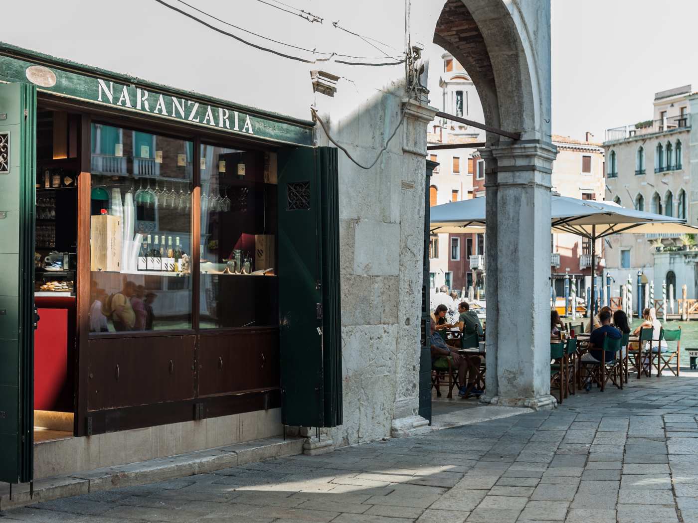 "On the market side of the Rialto Bridge, you’ll see a bunch of tables with views of a gondola station on the Grand Canal. Choose a seat that belongs to this wine bar. Most cicchetti in the city is focused on seafood, and while Naranzaria has some terrific fishy options, they really specialize in meat. Order a mix of mortadella, prosciutto crudo, and silky strips of guanciale on bread, and if they’re doing meatballs that day, get a few of those, too. The inside space is pretty narrow, but we love standing at the long bar with a spritz on a winter afternoon, under the glow of Campari bottle light fixtures." - Gillian McGuire