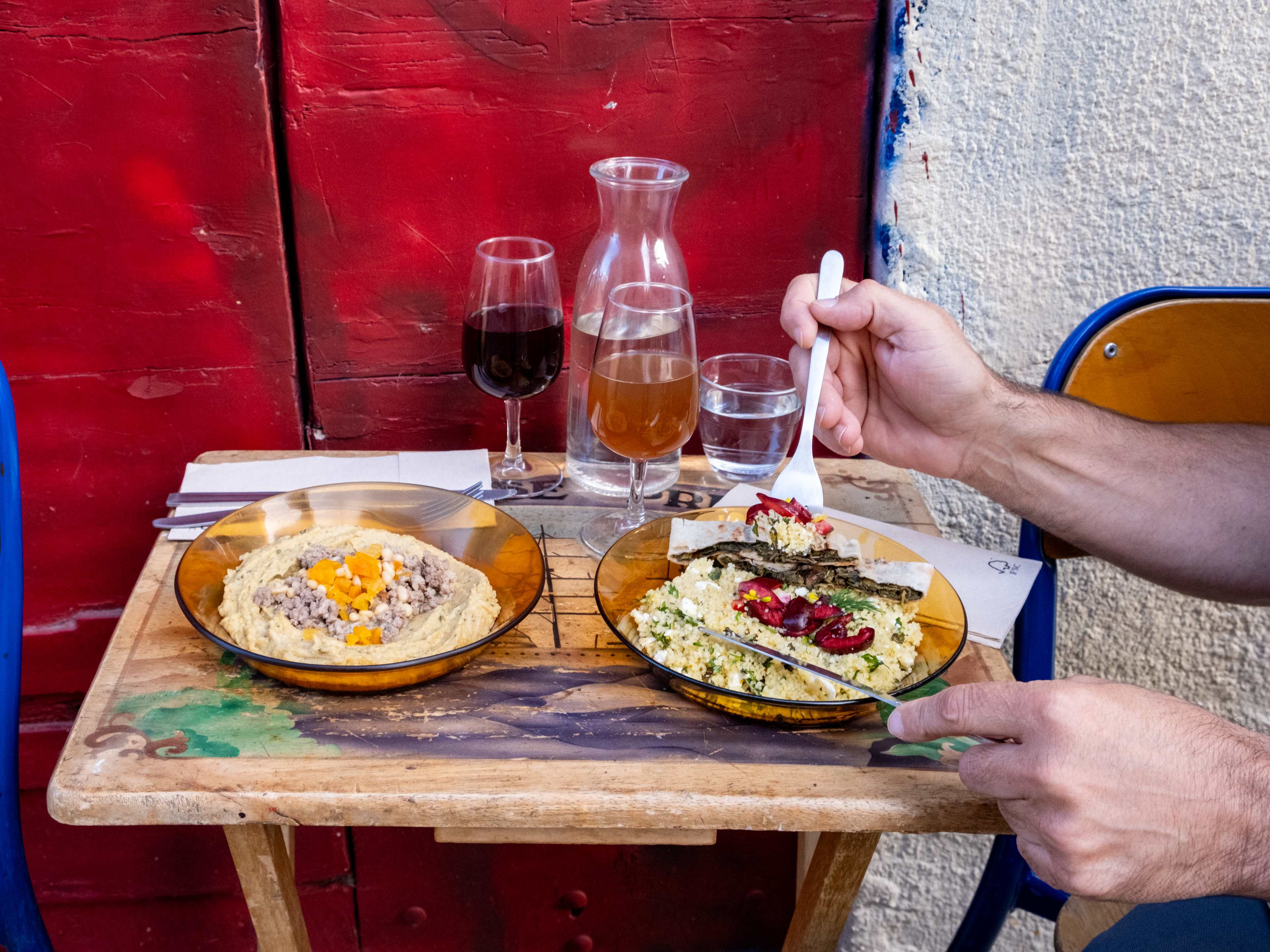"On any warm evening, the sidewalk and entire dead-end street surrounding Le Vin Sur La Main are filled with mismatched vintage chairs and tables. Marseillais arrive by bikes, sometimes with their dogs, pulling up for a glass. It’s not uncommon to hear English, and if you’re sitting inside—a shoebox with rough stone walls, soft bossa nova, and low lighting—you’ll likely make new friends. Wines are all €7-€9 by the glass or from €30 per bottle, and everything is natural and from Provence. The short food menu always has fish (from the market at Vieux Port) and vegetables (from an urban farm in the 14th arr.), in dishes like mullet crudo with garden peas and rhubarb. You can pay by card except when there’s a guest chef, which is usually Sunday but can change, so check their Instagram before you go." - sophie friedman