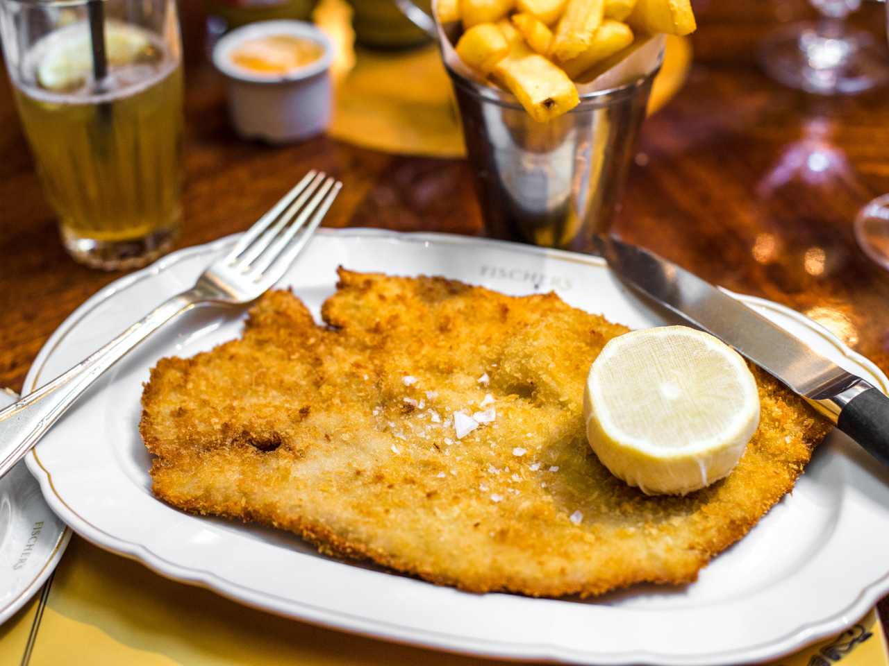 "Marylebone’s premier Viennese brasserie feels like it’s from another time. Gold-framed portraits of men with moustaches and women in cocktail dresses hang from semi-tiled walls, the toilet doors have a little golden curtain rail, and any number of things feel like they could happen in this room—from a murder to marriage. What most people are here for is gold-hued and crispy: Fischer’s schnitzel is a flat, crisp piece of meat, big enough to throw around the park on a sunny day, and it’s best paired with chips." - rianne shlebak, heidi lauth beasley, jake missing, sinead cranna