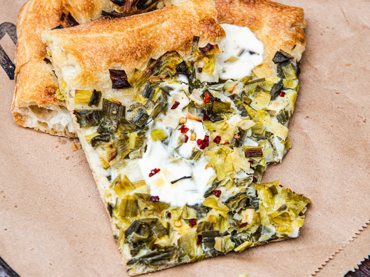 "For: Strecci The downfall of many bakeries in London is the poky seating. But not at Toklas. This Aldwych bakery is spacious and calming, with a display of sweet and savoury pastries—pistachio cream laminated brioche, ham and cheese pain suisse, and classic pain au chocolat. But our favourite thing is the strecci. A Roman-style pizza slice topped with combinations like leek and crème fraîche, or potato and olive tapenade. Take a seat in their cafe to eat it and stick around to get one of their hefty sourdough sandwiches for lunch." - rianne shlebak, sinead cranna, daisy meager