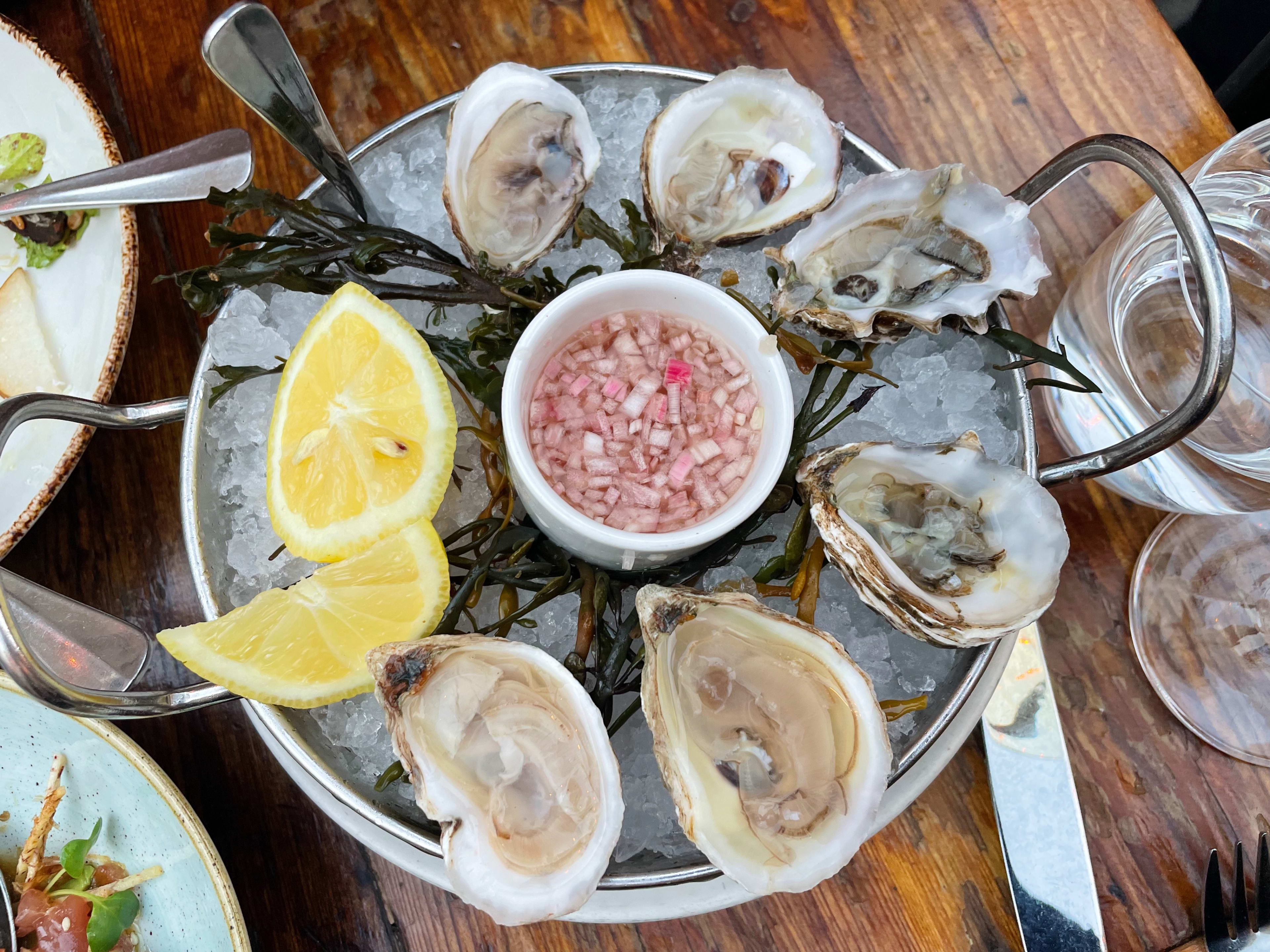 French seafood & seasonal dishes, natural wine, octopus hot dogs