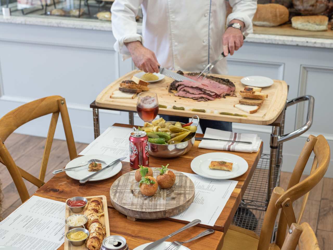 "When you walk into a restaurant and it’s filled with old men eating soup, your meal is either going uphill or downhill, stat. Fortunately, at Greenwich & Delancey, it’s the former. The star of the menu at this upscale kosher deli is undoubtedly the pastrami sandwich, which at $36 is almost $10 more than Katz’s on the Lower East Side, but you’re in Greenwich, after all, and it’s worth it. Start with the comforting chicken consomme with pelmeni and then move on to the main event, where the juicy pastrami is piled high onto homemade rye and served simply with spicy brown mustard and excellent all-you-can-eat pickles on the side. If you’re with a group and feeling flush, shell out $80 for the tableside service, where a whole side of pastrami is wheeled out on a cart, unveiled in a fragrant puff of smoke, and sliced like a prime rib for a make-your-own-sandwich adventure. Go on a weekday or Sunday, since the restaurant is closed for Shabbat. photo credit: Sam Schwab" - Chloe Zale