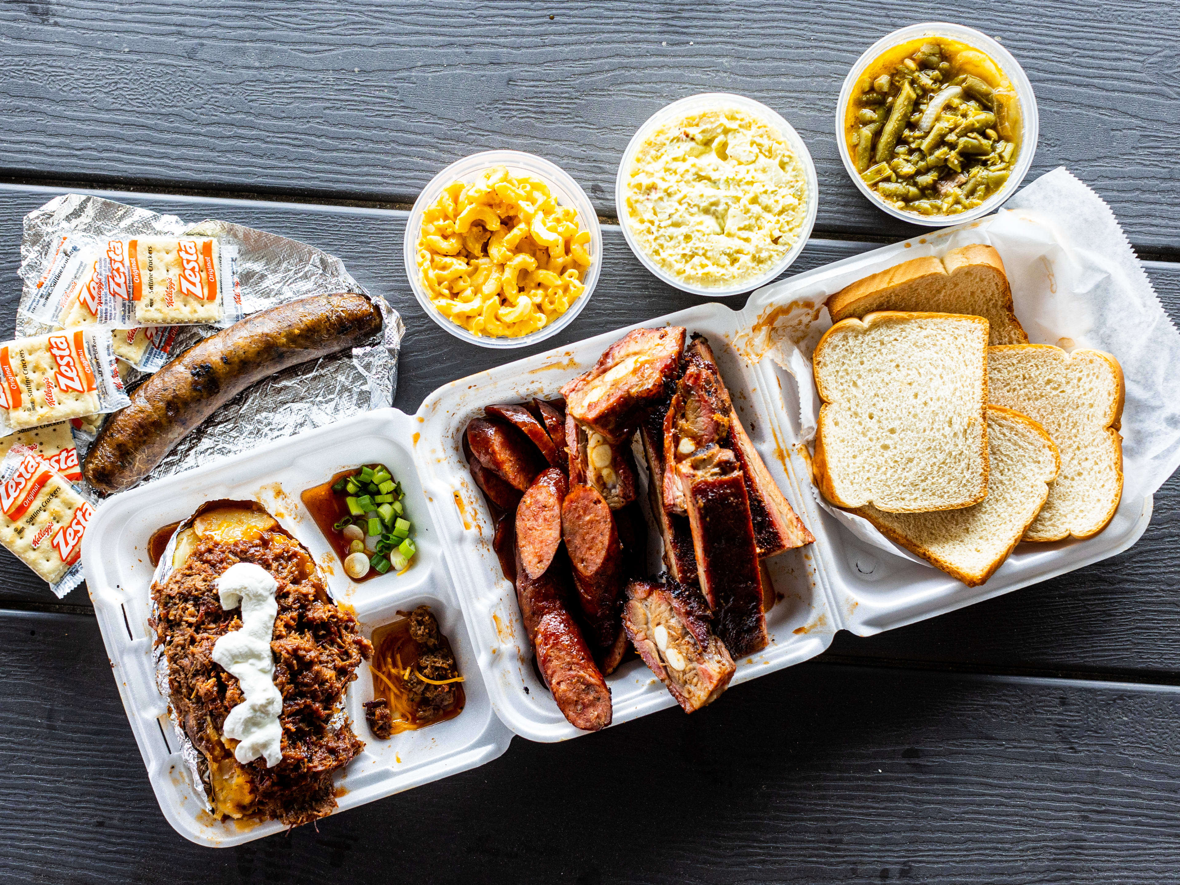"You can tell by the giant flames mural and faint bass lines bumping inside Triple J’s Smokehouse in Trinity Gardens that a meal here will be a party. Mostly a take-out joint, Triple J’s stays packed with a long line snaking around the inside, as neighborhood folks and anyone working nearby queues up for a takeout tray loaded with smoked meat. Known for loaded baked potatoes and an enormous line of folks angling for giant turkey legs every year at the Houston Rodeo, Triple J’s smokes up some of the best old school Houston barbecue in town. photo credit: Richard Casteel Open since 1994, Triple J’s represents a specific, old school style of Houston barbecue: Part country cookout, part Texas-style low and slow smoked barbecue, and part East Texas potluck, all smashed together. With new school Central Texas-style barbecue garnering all the accolades, sidelined East Texas barbecue tastes comforting and nostalgic. Lifelong Houstonians that grew up going to rodeo cookouts or big country picnics know this style well, likely because it was force-fed to us from infancy. Add on fast-paced but familial service, walls heaving with every ironic joke and punny sign imaginable, and a mostly standing-room-only dining room, and you’ve got a barbecue spot built for the neighborhood. While most of y’all think brisket represents the be all, end all of barbecue, but we think that’s some Central Texas propaganda. While we love a tender fatty brisket as much as the next person, the brisket at J’s takes more of a supporting actor role, and is best served chopped over a giant baked potato. But the smoky, sauced-up pork ribs, fire-breathing boudin, and fatty sausage here will expand your definition of what constitutes some solid ‘cue. The sides here hit just right, with homestyle macaroni and cheese and pot likker-stewed green beans that have the same deep, soulful flavor as any of the meat. And if your cue doesn’t come with quite enough sauce, there’s a five-gallon spigot dispenser full of sauce by the to-go silverware. photo credit: Richard Casteel photo credit: Richard Casteel photo credit: Richard Casteel photo credit: Richard Casteel photo credit: Richard Casteel Pause Unmute The experience at Triple J’s focuses on the whole meal, the familiar friendly service, and running into your neighbor or teacher or sister’s boyfriend’s little cousin while waiting in line. And when you see folks carrying out multiple plastic bags shoved full of sides and sausage, you know somebody somewhere is about to feast. We appreciate that old school spots still have long lines holding it down for Houston country-style barbecue. Go here if you want a takeout meal you won’t forget, some of the best boudin in town, or a barbecue blast from the past. Food Rundown Ribs The smoky pork ribs will have you licking the bone, your fingers, and possibly the to-go container. We will throw down on these every time. photo credit: Richard Casteel Sausage Spicy, snappy, porky, and loaded with spices, the sausage at Triple J’s could sustain us. Actually, if we are ever lost at sea, but somehow had a magical and preferably large emergency stash of J’s sausage, we might be okay, maybe. For now we’ll just keep ordering it to-go. photo credit: Richard Casteel Lil’ J Chopped Beef Baked Potato This Lil’ J ain’t so lil’, especially when it comes out loaded down with a ladleful of sweet and smoky chopped beef, cheese, and sour cream. There are a couple schools of thought here: take down the beef first and then enjoy the potato, or, our preferred method: Stirring it all up into a cheesy beefy mash, just like we did as kids. photo credit: Richard Casteel Spicy Boudin What makes a great boudin is personal, and while this ain’t Louisiana, plenty of us Texans enjoy this spicy sausage and rice Cajun meat treat. It’s especially good (and actually spicy) at Triple J’s, where it comes with the only thing a truly great boudin needs: Saltines. photo credit: Richard Casteel Macaroni And Cheese The execution of any batch of macaroni and cheese is liable to divide entire families. Wars have probably been started for less. Macaroni and cheese is deeply serious, and Triple J’s knows this, and beautifully delivers a cheesy, not-too-creamy, but not overbaked, just-right version that could mend whatever broke the Hatfields and McCoys. photo credit: Richard Casteel Green Beans The first time we tasted the green beans, we closed our eyes, took a deep breath, and felt at peace with the world. While you might not experience this specific level of amazing food-induced nirvana, we will say the deeply flavorful (probably mostly from pork) pot likker of these green beans will taste how you wish every vegetable (again, so much pork) could. photo credit: Richard Casteel" - Chelsea Thomas