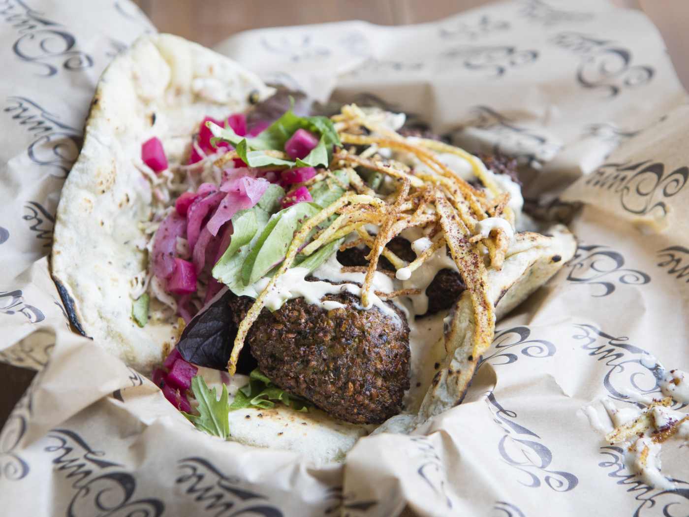 "Dune is an order-at-the-counter Mediterranean spot with locations in Atwater Village and Downtown. While you really can’t go wrong with anything on the menu, your first order of business should be the green herb falafel sandwich, which involves perfectly crisp falafel on house flatbread topped with hummus, marinated onions, tahini sauce, and shoestring potatoes. This is a wrap we’ll drive out of our way to eat. Order: Falafel Sandwich, $9.50." - brant cox