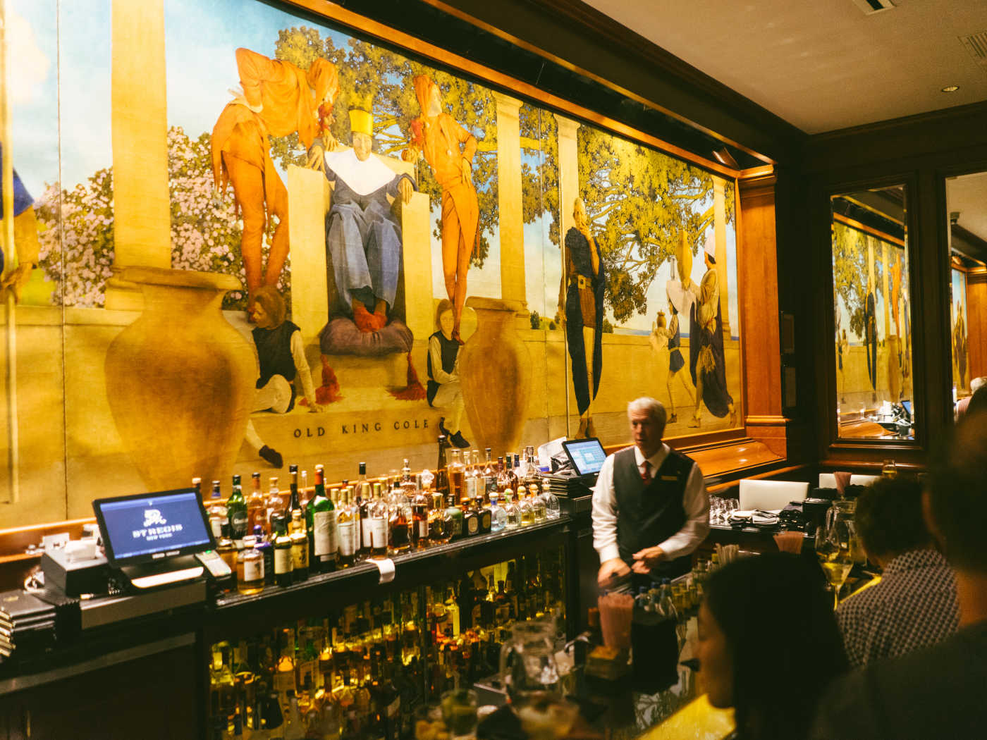"At this bar in the St. Regis Hotel, the dark wood walls are the perfect frame for the centerpiece and namesake: Old King Cole, of nursery rhyme fame, in an iconic 30-foot-wide mural by Maxfield Parrish. King Cole Bar also furnishes excellent free snack mix, top-tier people-watching, and an atmosphere of fur coats and generational wealth that improbably manages to feel warm and welcoming. The comfortable leather bar seats and tasseled chairs certainly don't hurt. The Bloody Mary was supposedly invented here, and they make quite a good one for $30. Lightly spicy, smooth, and boozy, it even comes with a logo-branded wood stir stick. But we like this place even better for a swanky, stiff, Midtown East martini. photo credit: Molly Fitzpatrick" - Molly Fitzpatrick