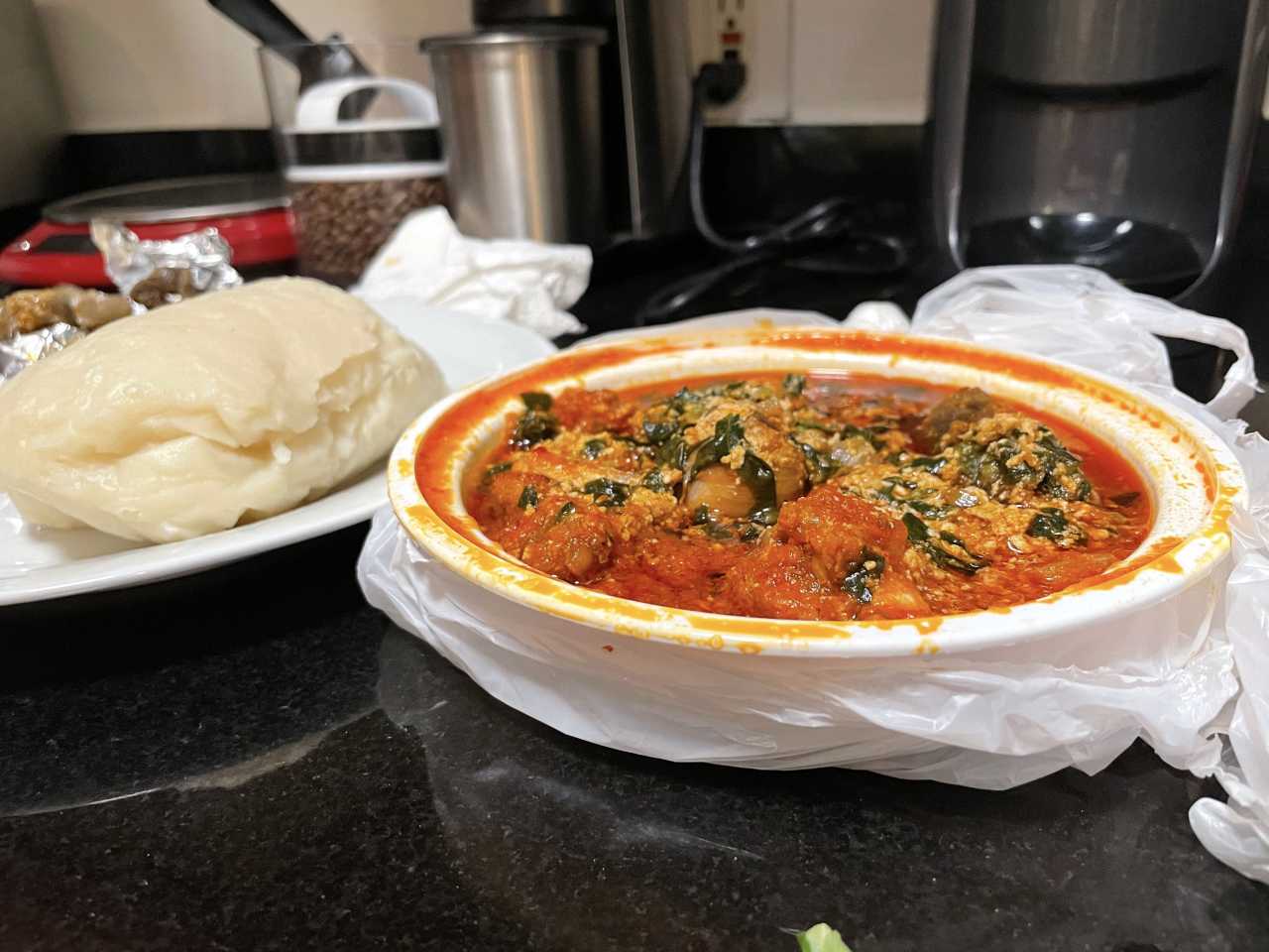 "Pounded Yam With Egusi Miami has very few African restaurants, which is all the more reason to support the ones we’ve got. And it’s easy to support a place like Moji, because the food here is great. Moji, a casual spot with a pool table and some counter seating, specializes in West African food. They don’t take orders over the phone, so I had to come in person to get my egusi with fufu (pounded yam) and jollof rice. Both were very tasty, but the egusi with pounded yam is definitely something I’ll be ordering again. Moji makes this stew very spicy, with hunks of braised meat, bell peppers, onion, spinach, and a big ball of fluffy pounded yam for dipping and absorbing." - ryan pfeffer, carlos c olaechea