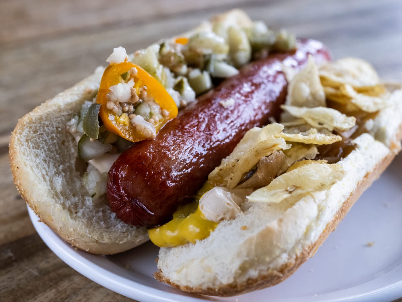 "Tio Baby’s is an inimitable palace of queso, really good zero-proof stuff, and salads that make us want to eat more produce. But it’s impossible to ignore their Seattle dogs, topped with giardiniera, crushed potato chips, and a swipe of sriracha-hondashi cream cheese (that we could use more of, by the way). Though, we’re here to specifically hype the non-meat version, featuring a vegan sausage that’s been deep-fried to mimic the blistered crackle of a hot dog’s casing. " - gabe guarente, aimee rizzo