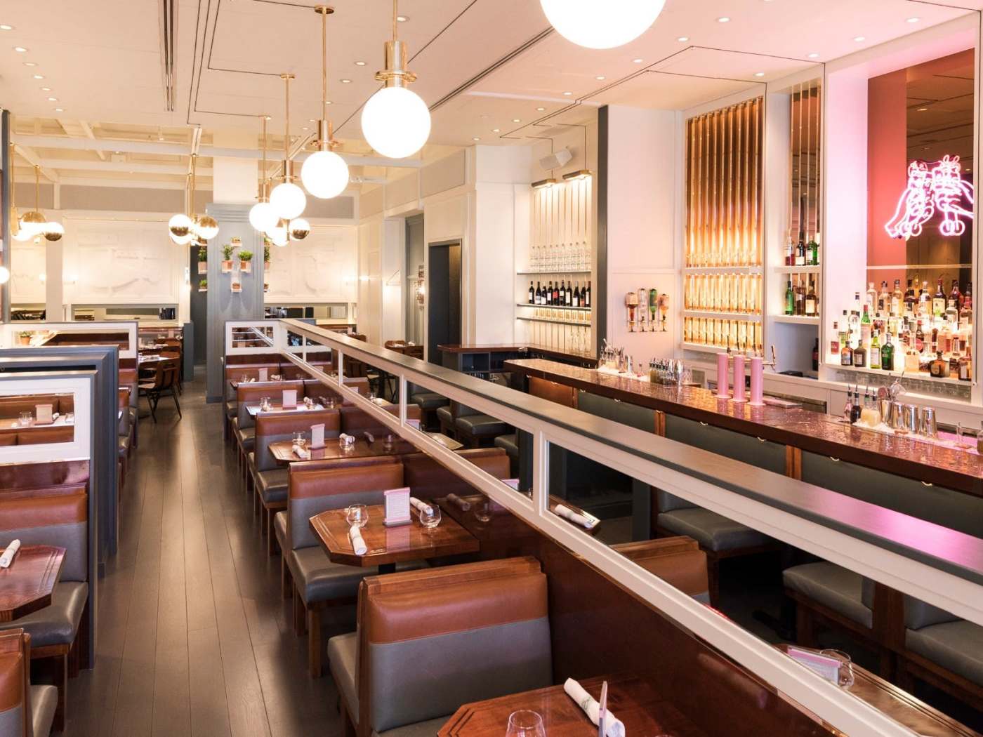 "Quality Eats put a lot of effort into their stylish, baby blue semi-outdoor seating set up with tables separated by walls and curtains that make the structure look like a row of private pool bungalows. If you want to eat your steak and roasted beet tabbouleh completely in the open air, they also have bistro tables for two on the sidewalk patio. " - matt tervooren, neha talreja