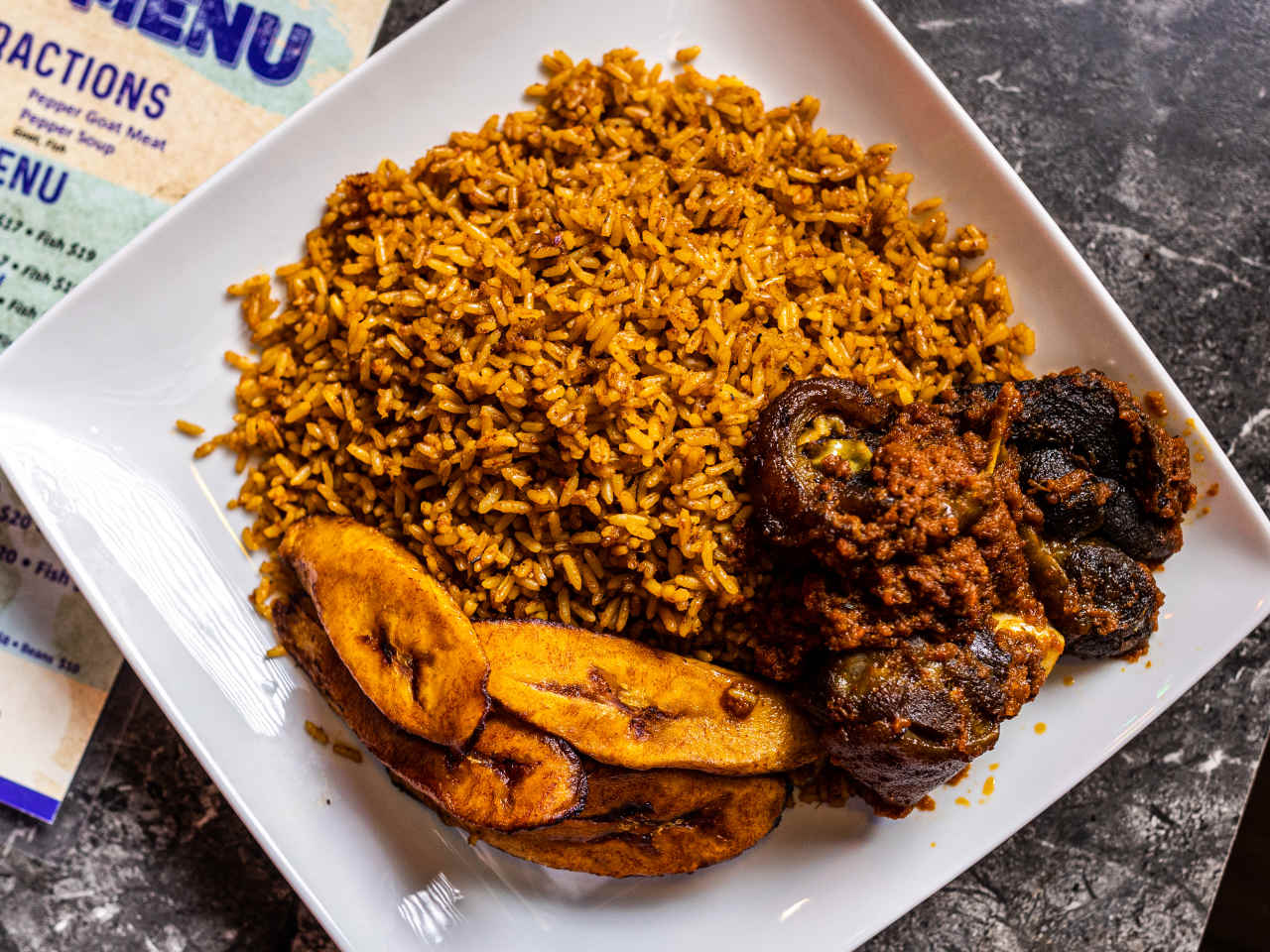 "You might think you’re walking into a nightclub when you step into Baba Jollof in Alief, but outside of the blue mood lighting and glossy couches, this Nigerian restaurant is unpretentious and cozy. Even though the name is Baba Jollof, stick to the smoky beef suya or the goat pepper soup, which is full of habanero peppers and scotch bonnet that team up to test the strength of your spice tolerance. During the day, most folks come to Baba Jollof for a quick takeout lunch, but come during the evening if you want to make the most of the dramatic purple mood lighting, and eat a sinus-clearing soup in what feels like a secret club." - gianni greene