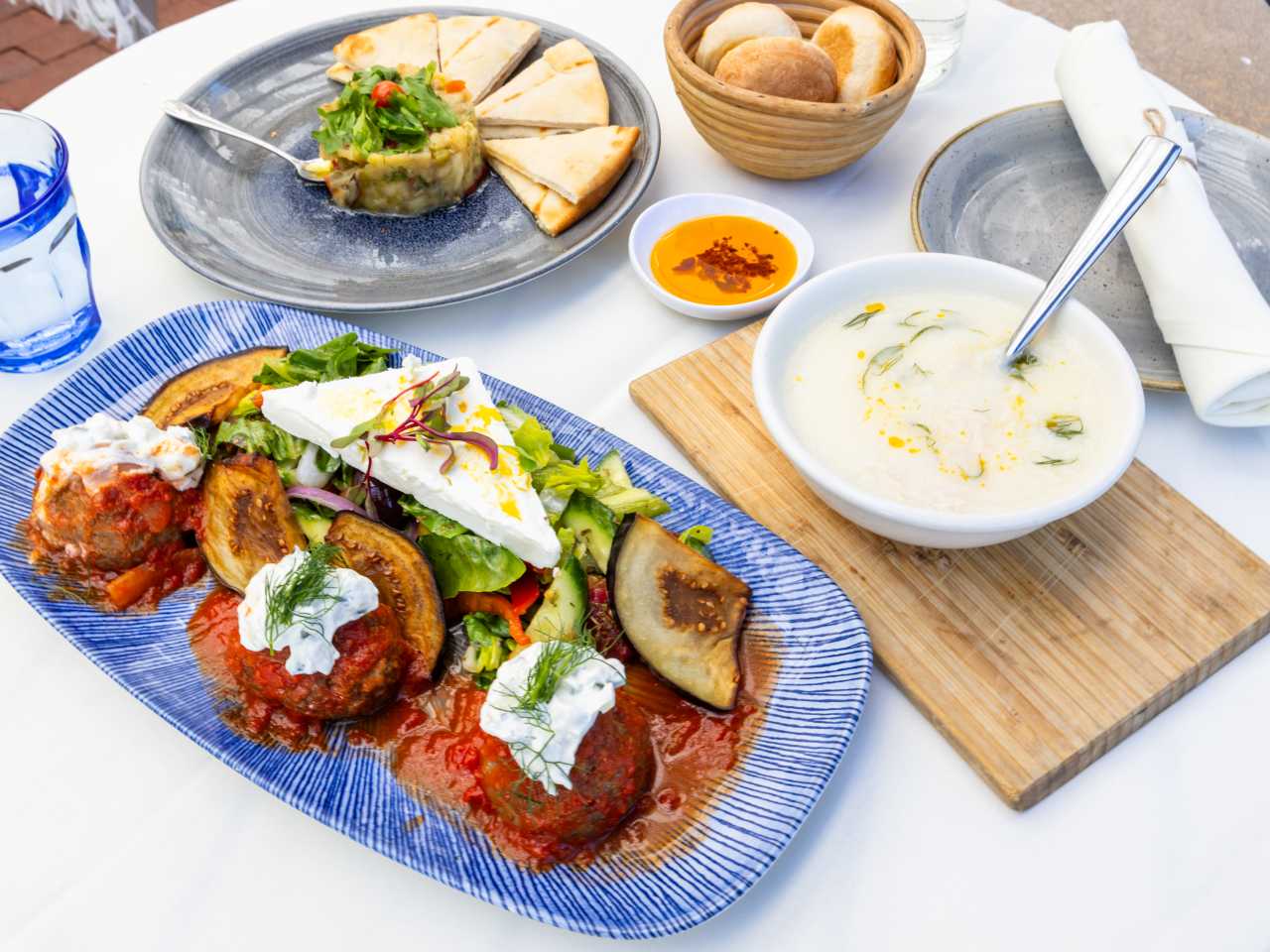 "Elia is more Mykonos than restaurant-across-from-Wells-Fargo, with its all whitewashed walls, sleek tables, and abundant greenery. Automatically start with just-baked bread and grassy olive oil with crushed kalamata olives while you peruse the menu. Make it easy and get the slightly sweet roasted eggplant dip with flecks of roasted red peppers, the avgolemono soup, and the beef and lamb kefthedes, with tomato sauce and tzatziki that’s hearty without being heavy. If the weather allows, sit on the airy front patio–it’s great for a casual daylight hang and the right setting for a romantic date after dark." - Gabi Moskowitz