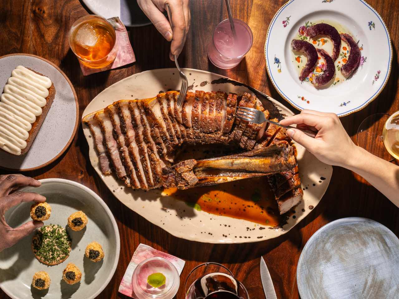 "Kabawa doesn't stick to the usual fine dining template. It’s fun and loose, and you won’t need a sandwich after. The Caribbean-inspired restaurant in the old East Village home of Momofuku Ko serves a three-course prix fixe with more than enough food and charisma to justify its $145 price tag. Around a U-shaped counter, roughly 20 stools face an open kitchen where cooks in tie-dye aprons pan-fry chuletas while soca bounces off the walls. The meal kicks off with a roti platter that puts most table bread to shame, then, depending on your choices, it might veer into cassava dumplings, jerk duck sausage, or, ideally, a slab of braised goat that cuts as easily as the accompanying side of sweet potato. Finish with a brick of funfetti flan, and stop by offshoot Bar Kabawa next door if you need a daiquiri to wind down." - Bryan Kim