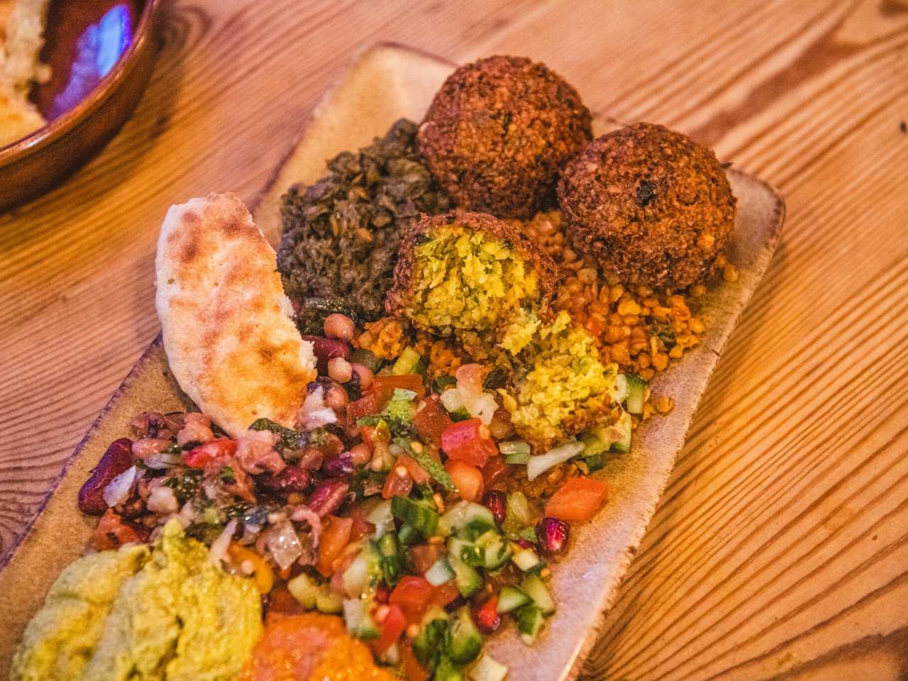 "The Kurdish restaurant on Rye Lane always has two big glistening shawarmas on the go. The chicken qozi is fantastic—it glistens with honey and lemon with the potatoes cooked under the meat absorbing all the fats and flavours to evolve into an entirely new kind of carbohydrate. But it’s the vegan mezze we think about most. The perfect group sharer, it’s got crunchy and light falafel, pistachio hummus, and dalooja (a red pepper and pomegranate dip)." - heidi lauth beasley, jake missing, rianne shlebak, sinead cranna