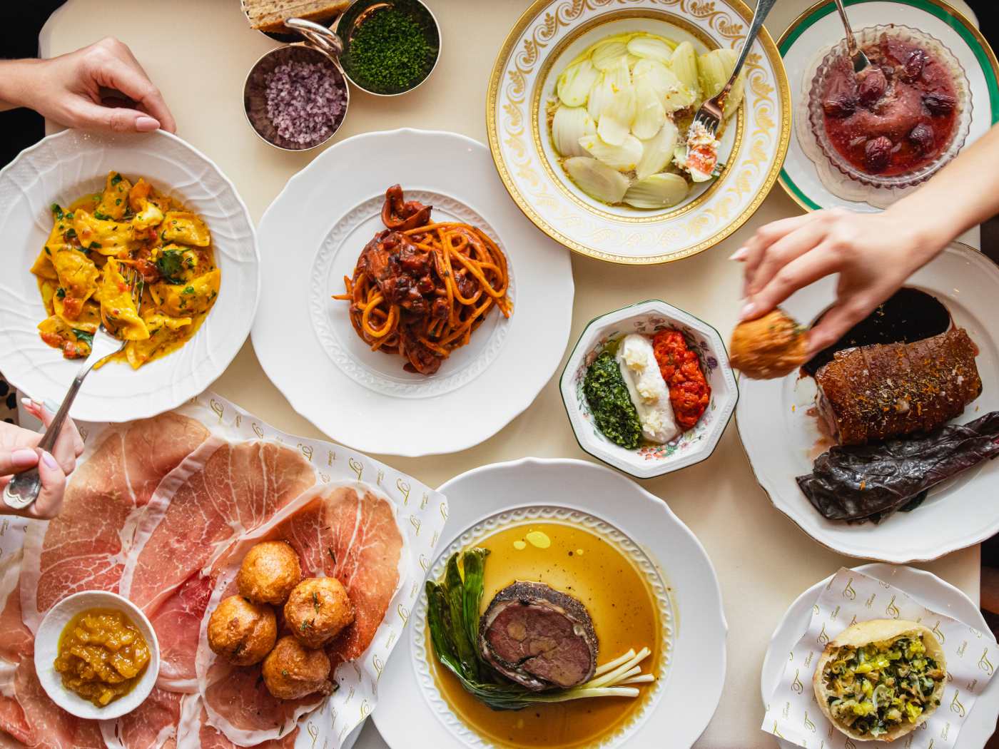 "Though technically across the Broome Street border into Nolita, Torrisi in the historic Puck Building feels emblematic of the Italian-American neighborhood. The restaurant is from the people behind Carbone, and while it shares some DNA (impressive design, servers in tuxedos, general pageantry), it’s bigger and more interesting, with inventive dishes (chopped liver with Manischewitz jelly) that are just as good as the classics (spaghetti with lamb amatriciana). If you can’t get a reservation—and you probably can’t—try the walk-in-only bar area for a special night out. Reservations are released online 30 days in advance at 10am. There's also a large bar area up front that's saved for walk-ins. We came on a weeknight around 6pm to see if we could snag a few of those seats, and they quoted us a four-hour wait. So maybe bring a crossword—or come for lunch." - molly fitzpatrick, willa moore, bryan kim