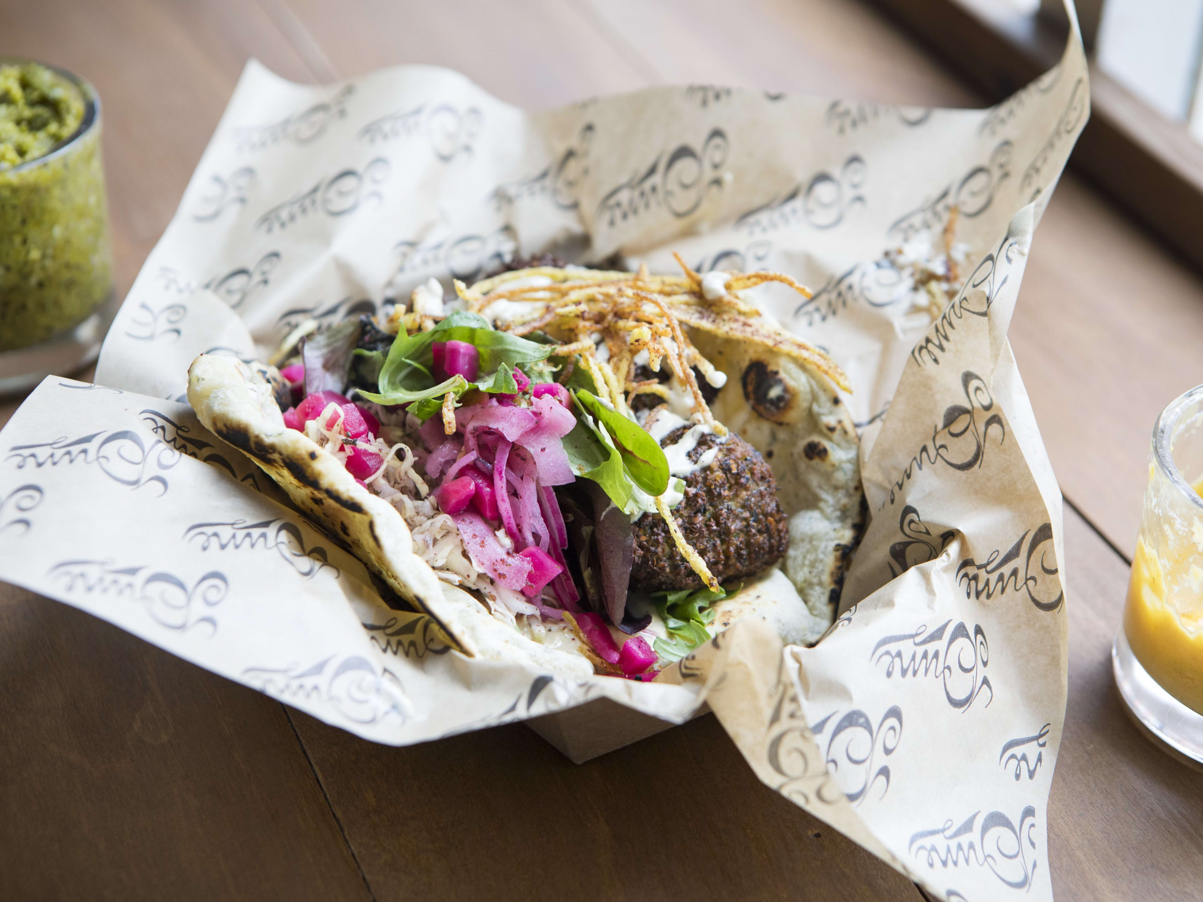 "Dune might appear to be just another neighborhood falafel joint, but crowds form outside this tiny Atwater for a reason—there’s not one miss on the menu. That includes their top-tier falafel, silky sides of hummus, grilled lamb plates, and their pièce de résistance: the fried chicken “shawarma” sandwich, which is easily one of the best in LA. The space is essentially a to-go window, but if you want to stay and eat your Mediterranean feast, there’s a big front patio where everybody stays and watches the sunset. " - sylvio martins, brant cox, nikko duren