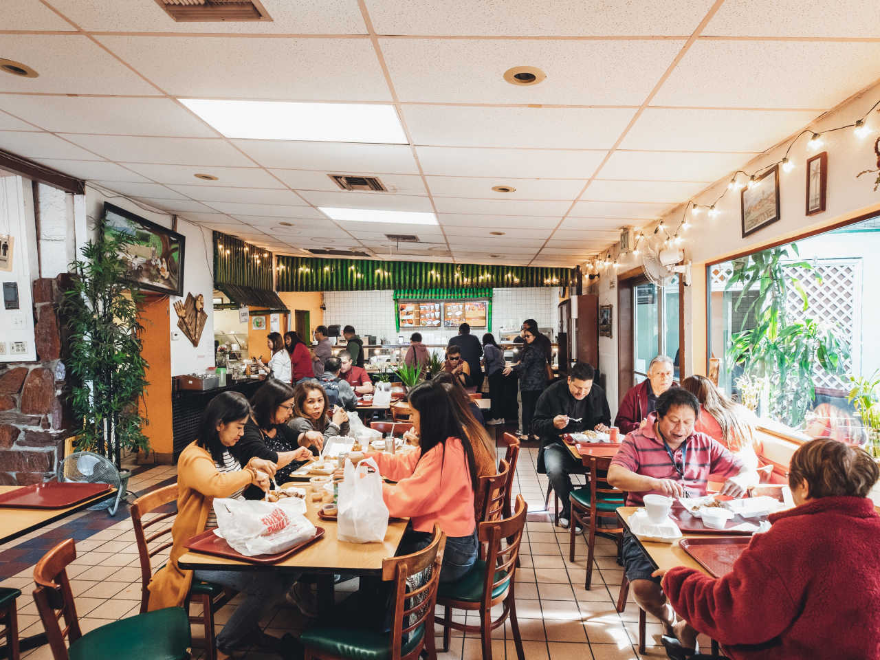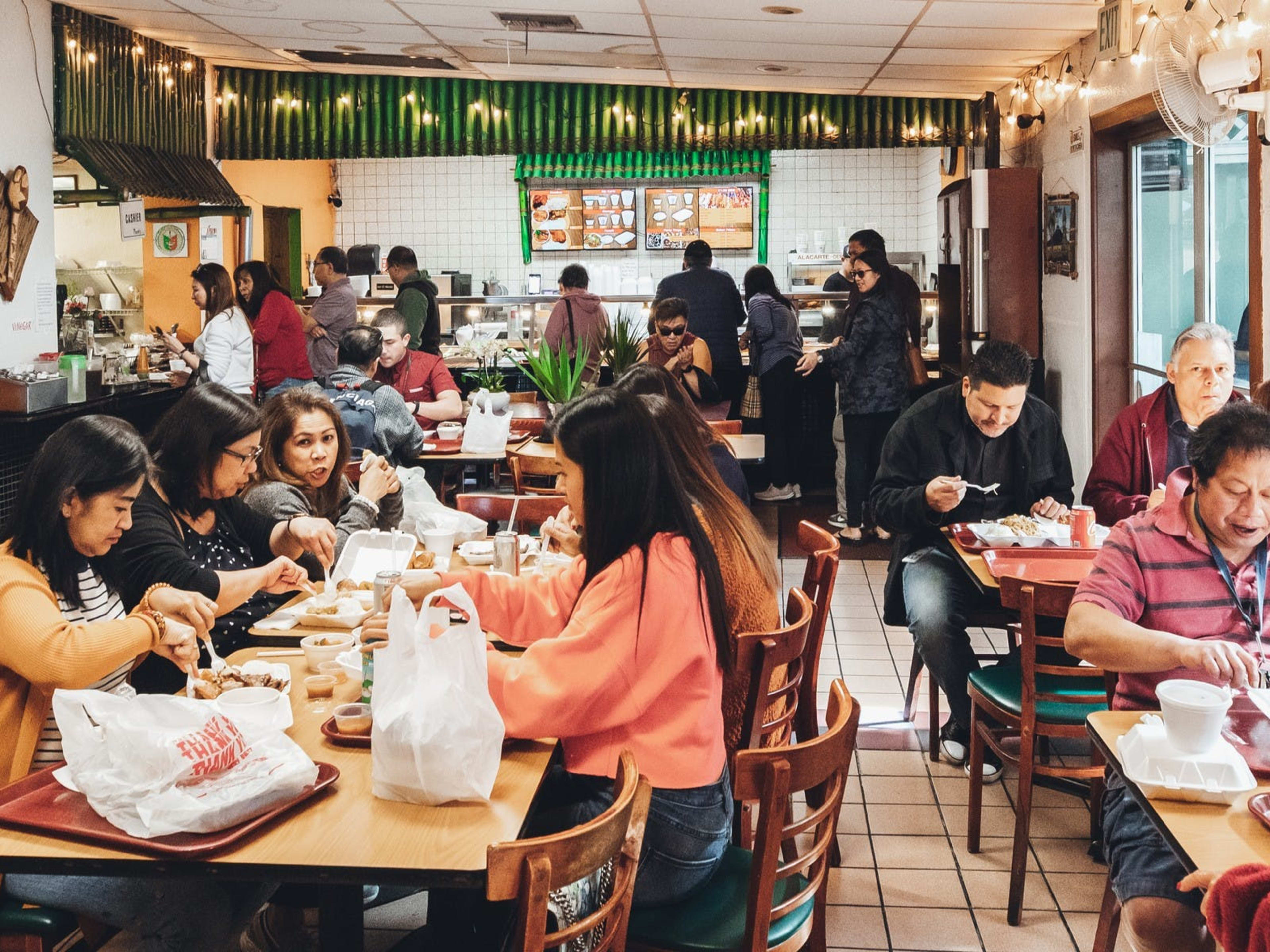 "Whether you ruled over your high school cafeteria with an iron fist or were so traumatized by its internal politics that you now talk about it every Thursday with your therapist, don’t let your past history with lunchrooms stop you from eating at Bahay Kubo. This very affordable Filipino restaurant is set up “turo-turo,” or cafeteria-style, where you build your own plates by literally pointing at what you want from their broad display of hot foods. If you’re familiar with the cuisine, you’ll recognize Filipino favorites like heaping pans of pancit noodles, turon (sweet, deep-fried lumpia made with bananas), and kare kare (a thick, savory stew made with peanut sauce). But if you’re more of a novice, worry not, the people behind the counter will patiently walk you through what’s on the steam table, which of course, means lots of tasting." - kat hong