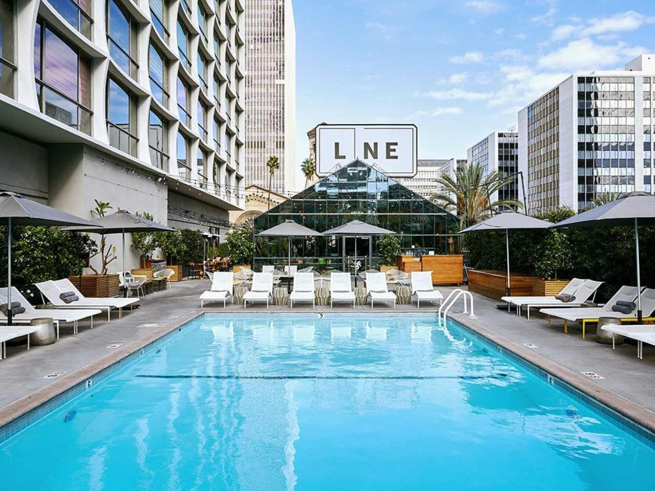 " In addition to an all-day restaurant set inside a greenhouse, the rooftop at The Line Hotel in Koreatown also has a resort-style pool. It’s lined with reclining lounge chairs and big umbrellas where you can order bar snacks and hear live DJ sets on weekends. The breakfast and lunch menus here have a solid mix of omelets, sandwiches, and bowls of granola-topped chia pudding. Most people simply come here for a scenic departure from the chaos that’s always happening down on Wilshire. " - nikko duren, kat hong, brant cox