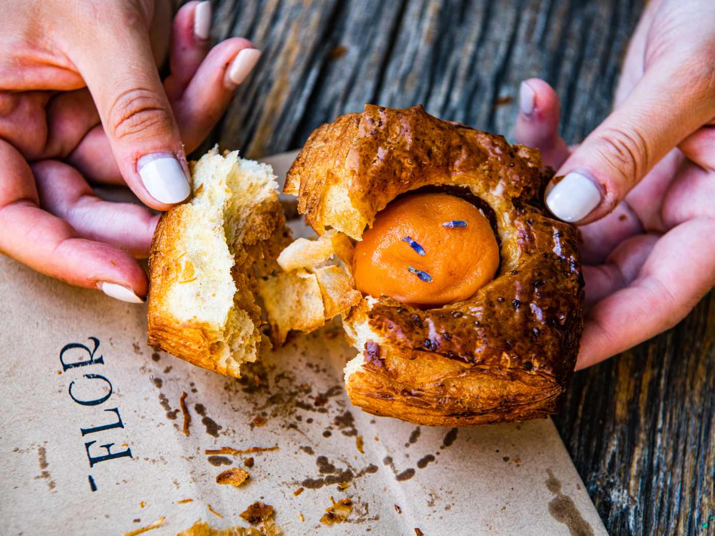 "The first thing you need to know about Flor, from the people behind Lyle's, is that they make a mangalitsa pork-stuffed sausage roll so good, we ended up eating it for breakfast over a croissant. The second thing you need to know is that the bakery mainly serves as a wholesale unit for London's top restaurants which explains why the address will lead you to a gravelly car park in a production estate in Spa Terminus. But from Thursday to Saturday, they lift the shutters and set up trays of bread, seasonal fruit and vegetable tarts, and danishes for the public to grab and go. Everything is made with organic wheats and heritage grains which give the loaves, pastries, and cakes a rich, nutty, and wholesome flavour." - Daisy Meager