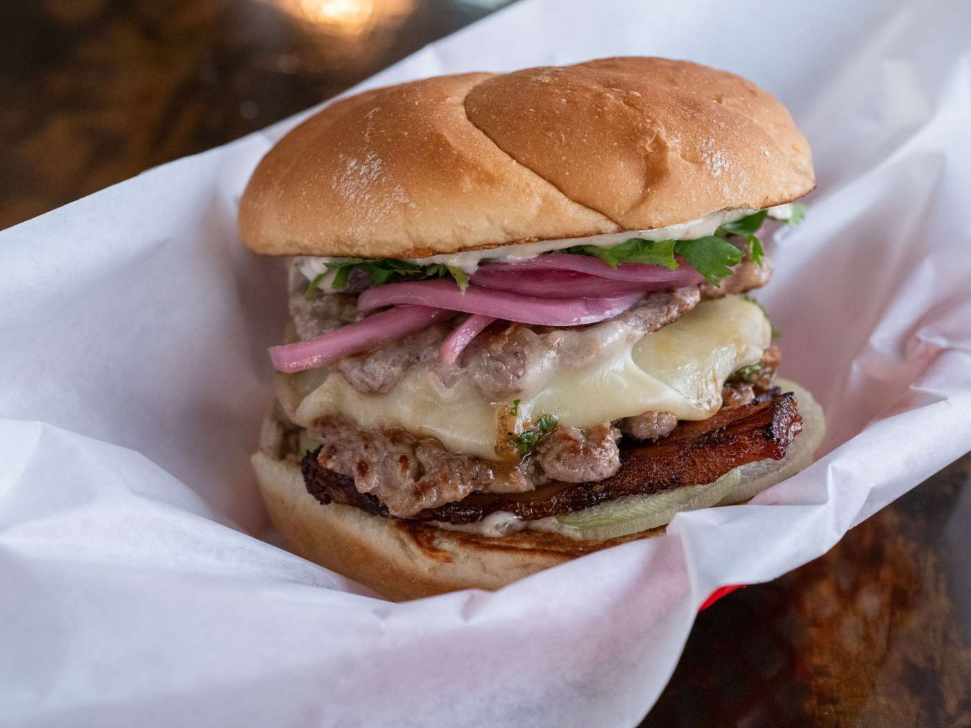"“The last time I got takeout from Taurus Ox, I ordered a large spread of excellent Lao dishes like their beef jerky with sticky rice and khao soi, as well as two of their incredible smashburgers to share with my household. When I was halfway home, they called to tell me they only packed up one burger but had another one waiting. I immediately panicked and turned the car around, picked up my additional burger, quickly drove home, and unpacked the bag to find out they had actually given me three burgers. This felt like getting an onion ring in your order of fries, only if that onion ring was a winning lottery ticket instead. As I started eating the double stack with provolone, taro stem, cilantro, and their spicy jeaw bong mayo, my pipe dream of saving the extra burger for lunch the next day vanished. As did the burgers.”" - julia chen 1, carlo mantuano, aimee rizzo