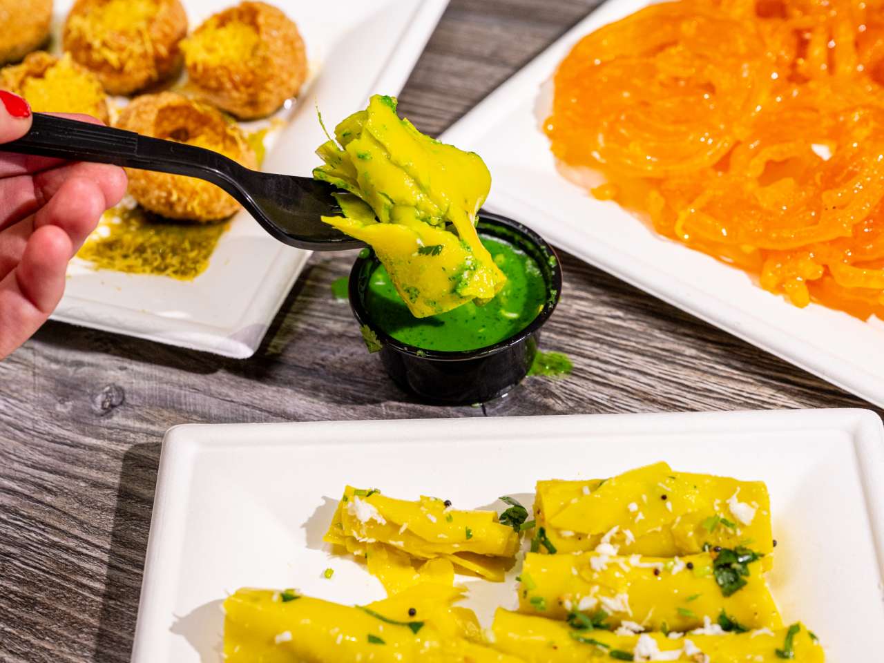 "Surati Farsan Mart can feel a little chaotic when you first walk in. It’s always packed with people drinking tea and eating chaat, which means you’ll probably have to wait in a long line and fight for a table. But the South Indian sweets and snacks here make the whole experience worth it. They serve hot, spiral-shaped jalebi coated in bright orange sugar syrup, saffron-dusted spheres of deep-fried ladoo, and our favorite pan puri in town. When you finally reach the counter, they’ll price everything by the pound. We usually get a tray of Indian street food to eat on the sidewalk patio and a gift box full of chocolate rose coconut rolls to take home." - nikko duren, brant cox