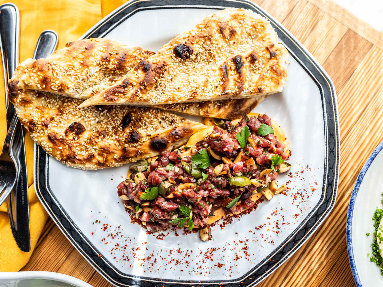 "Nancy’s Hustle knows how to set the mood with candle-lit tables and fuzzy reel-to-reel records while converting you to team tartare. Their version comes with lamb instead of beef, and any gaminess gets balanced out with crunchy almonds and briny green olives. Load hefty scoops and some spicy aioli onto the soft, spongy, grilled-to-order flatbread that’s packed with so many sesame seeds you’ll find them clinging to your clothes for the rest of the night. If you walk in during peak dinner hours, space at Nancy’s Hustle will be pretty limited. Either commit to going for a sexy late-night dinner with someone who makes your heart sing, or try your luck at the bar or patio when they first open." - chelsea thomas, gianni greene