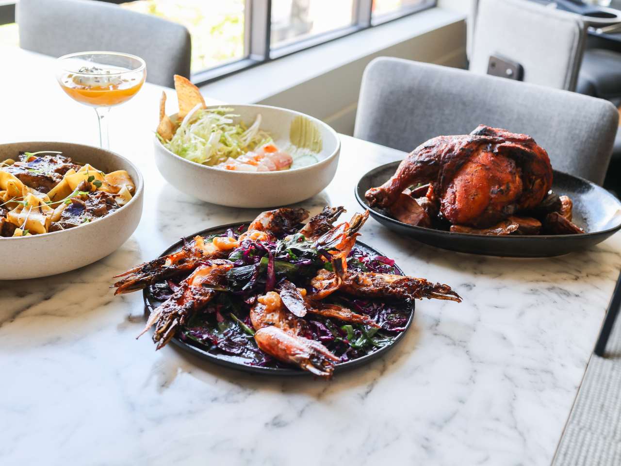 "When you hear the word Afrofuturism, you might think of Octavia Butler or the time your ex showed up to the Black Panther premiere wearing cat ears and a dashiki. If you’re in DC, you should think about Bronze, a restaurant that celebrates all Black culture through well-seasoned, inventive food. Walking through the front doors of the H Street spot starts your journey to the imaginary world of Alonzo Bronze, a man who after traveling the world for 700 years, has accumulated enough cooking techniques and spices from across the African diaspora to open up a restaurant. photo credit: Reema Desai photo credit: Reema Desai photo credit: Reema Desai Bronze the restaurant is as futuristic as Bronze the man's life. Sit in front of the enormous square window in the dining room that’s so big it’s like you’re in the Hubble telescope looking out at space (not just the H Street corridor). Portraits of Black women and men in gold jewelry and ornate hairpieces mirror friends dressed in sparkling tops and sleek dress having a girls' night out. Occasionally, you'll spot a fedora, chelsea boot, or tracksuit alongside a string of birthday dinners that will require you to bob-and-weave through a sea of high-beam selfie lights. Much like the decor, the food here is out-of-this-world. Each dish showcases spices from Ethiopia to the Dirty South. Mocktails are spiced with berbere. Oysters are topped with juicy fish roe and spicy chili. Yolky pappardelle is served with a slurpable oxtail. In an age where so many restaurants are obsessed with fake flowers and neon signs, Bronze will have you texting everyone you know to come back for the flavorful dishes just as much as the picture-perfect backdrop. Food Rundown photo credit: Alex Clirror Torched Oysters Instead of the usual sriracha and lemon, these bad boys are jazzed up with peppery chili flakes, juicy fish roe, and smashed cucumber bits that give you a cool yet fiery kick in every mouthful. photo credit: Reema Desai Braised Oxtail With Pappardelle With oxtail and pasta, it's hard not to love this dish. Buttery, fall-off-the-bone cuts of oxtail swim in a rich, yolk-yellow pappardelle. Where has this dish been hiding all your life? It's here now, and that's all that matters. photo credit: Reema Desai Grilled Poulet This well-charred chicken is coated with cashew bird's eye glaze—which tastes like a mix of paprika, chili, and a generous amount of pepper. Pair the juicy meat with some fingerling potatoes (which should come with the dish by default, but let's not dwell on that). Guava Cheese Donut This dessert is super small, so don't count on sharing it with your date—unless you're up for some passive-aggressive spooning, in the literal sense. It's a light treat, served with sweet cream, fresh blackberries, and a fragrant guava drizzle. Berbere Mocktail This smoky, peppery drink mixes spices like cumin, coriander, and cardamom with honey and chai tea syrup. It's not quite like anything we’ve ever had before." - Omnia Saed