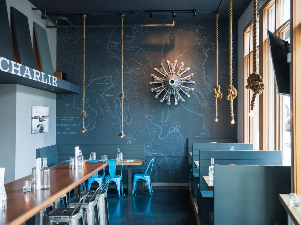 "Imagine what the queue for a Disneyland seaplane adventure ride might look like, and you’ll probably be picturing something like Bar Charlie. It’s a neighborhood spot with knotted rope light bulbs hanging from the ceiling, a plane propellor anchored behind the bar, and map schematics on the walls. The drinks, which range from an old fashioned with apple brandy and mole bitters to a lemon gin cocktail with rhubarb, are excellent, and the food’s impressive, too. Get the twice-baked loaded poutine potato covered in melted cheese curds, gravy, chives, and bacon." - aimee rizzo