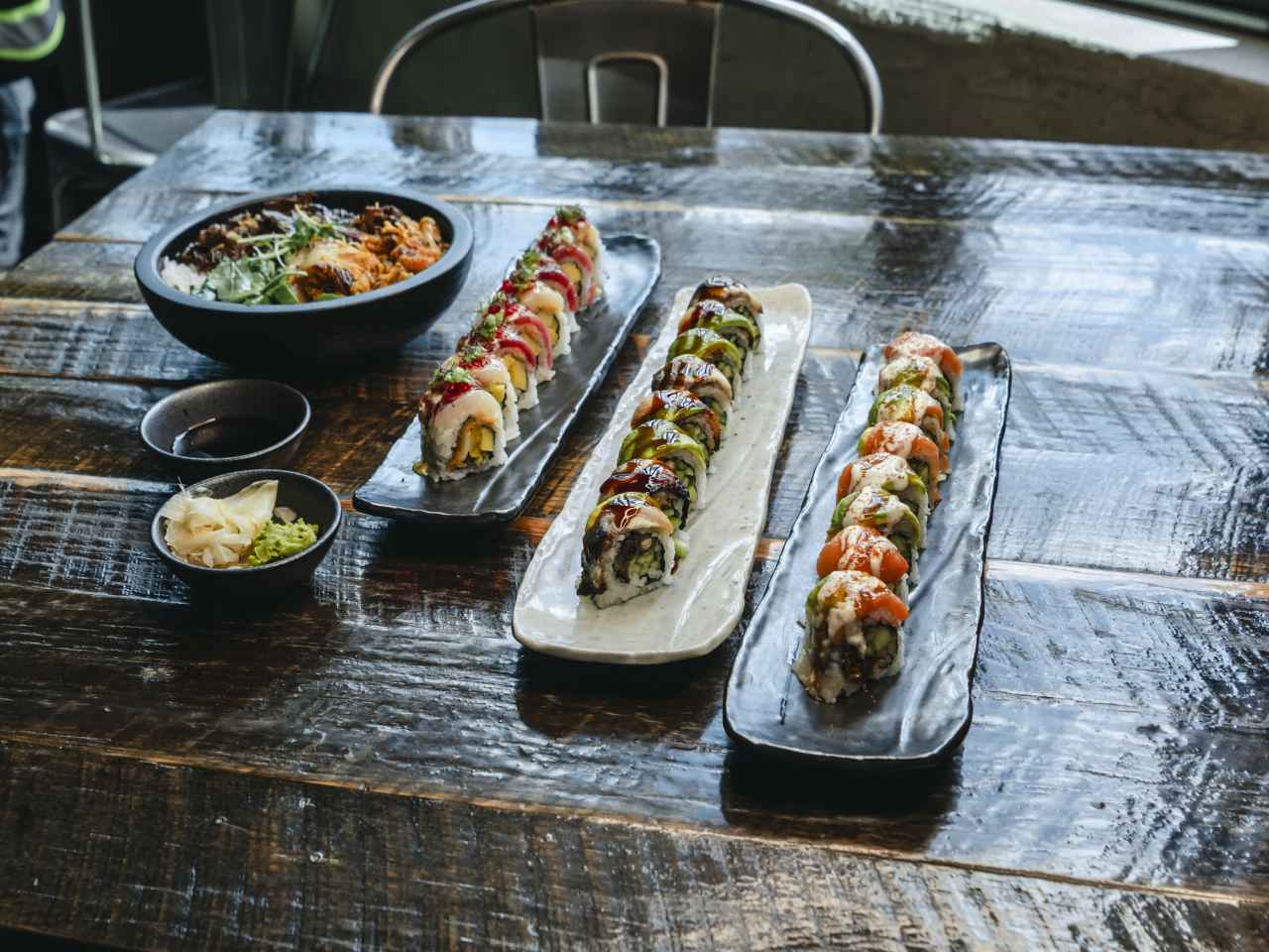 "With the amount of people packed into this very good sushi spot, you’d think it was the only place serving sushi within a 100-mile radius of Chamblee. They're here for the enormous variety of quality sushi and speciality rolls, and that’s why you should come too. With more than 50 signature rolls on the menu, it’s easy to go as plain (the California wrapped in seaweed) or as peppy (the filling Hot Night with fried scallops, mango, sriracha, tuna, red tobiko, and a drizzle of wasabi lime) as you like. Just avoid peak dinner hours unless you like waiting for a table and a lot of noisy chatter. Food Rundown Rice Cake These little rice cakes are our favorite small plate here. They come absolutely loaded down with melted mozzarella cheese and a nice portion of gochujang aioli for big flavor. Gyu-Don We know you’re here for sushi, but it’s worth ordering one less roll to try this rice bowl. The marinated short rib on top is so tender it can be eaten with a spoon and the fried kimchi adds some crunch and a powerful zing. photo credit: Tabia Lisenbee-Parker Smoky Delicacy This signature roll is a bit of a miss because it’s an overload of salmon skin. The smoky, crunchy skin overpowers the rest of the ingredients like the spicy kabayaki sauce and avocado. Firecracker Fried Roll This roll packs in spicy tuna, salmon, and crispy fried asparagus. The spicy aioli on top provides a nice sharp finish. Hot Night This is our favorite roll because it has a lot of flavors going on. The fried scallops are excellent, and the bits of mango and sriracha give a sweet and spicy combo that we dig. photo credit: Tabia Lisenbee-Parker photo credit: Tabia Lisenbee-Parker photo credit: Tabia Lisenbee-Parker Pause Unmute" - Juli Horsford