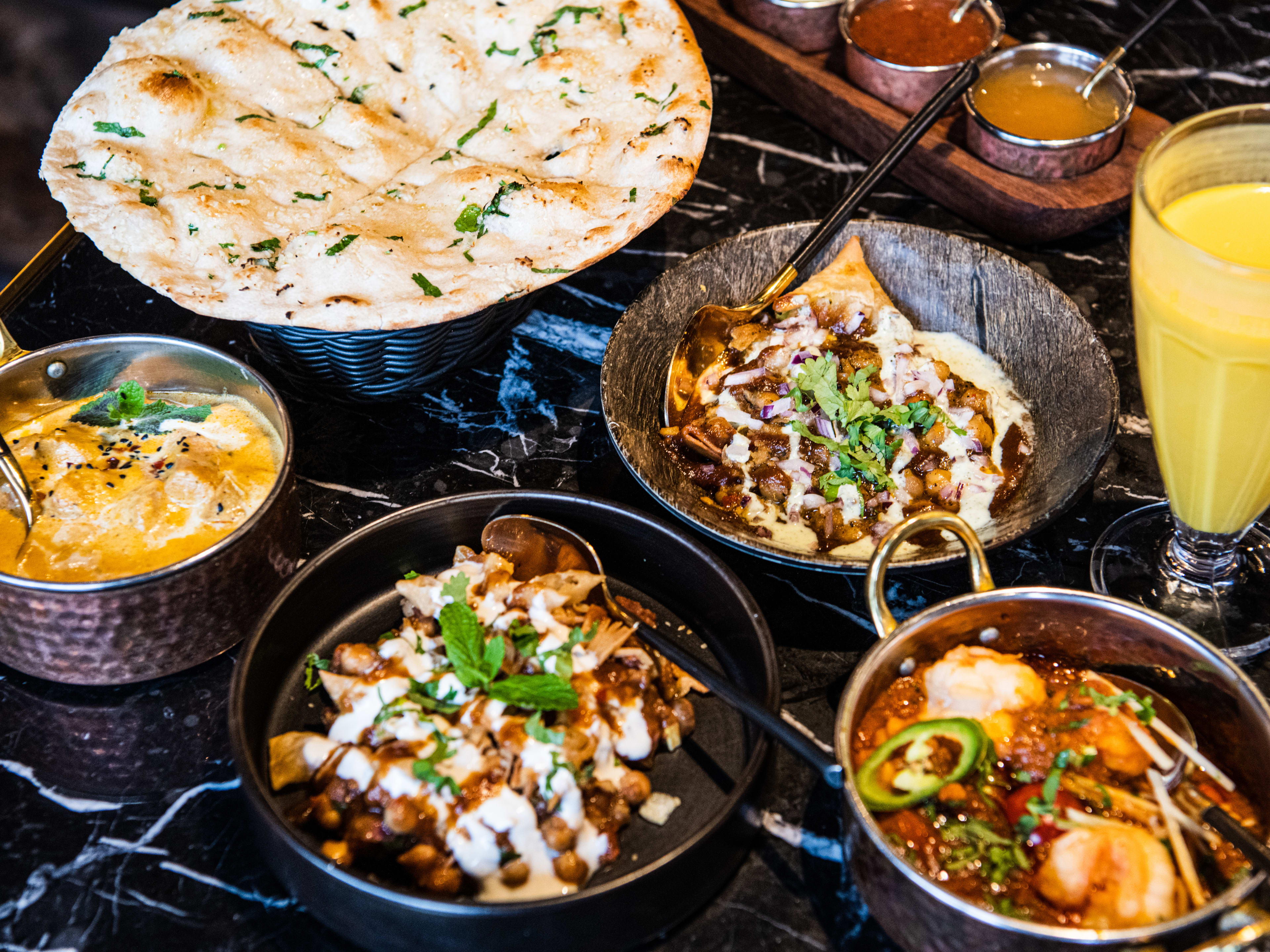 "Spice Village in Tooting is a bit OTT, with samosa chaat arriving atop a cauldron filled with smoke and mocktails presented in a top hat—with yet more smoke. But theatrics aside, the food is really great. Our go-to order is the spicy prawn karahi and pillowy, perfectly charred naan. While the space is big enough to accommodate groups, the moody lighting and velvet chairs scream date night. There’s a special occasion energy to this place, where you’re just as likely to bring a third date as you are to celebrate a promotion." - rianne shlebak, sinead cranna, jake missing, daisy meager