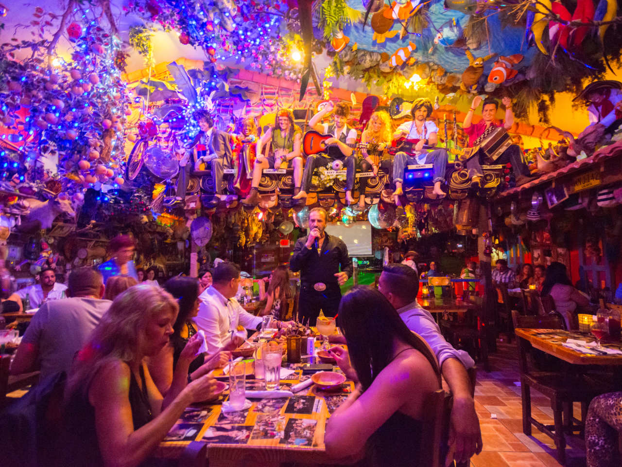 "MIAMI The entire entrance of Pueblito Viejo should come with a jumpscare warning—about a dozen stuffed parrots, Mickey Mouse toys, and wax caricatures will greet you on your way in. Once you’ve acclimated to the sheer amount of lights and puppets in this space, you’ll happily munch on Colombian dishes like apreas con chicharron while musical comedians roast you in Spanish. Pueblito Viejo knows it’s campy and fully leans into it, so don’t bother trying to hide from the musicians and embrace your fate. " - anne cruz