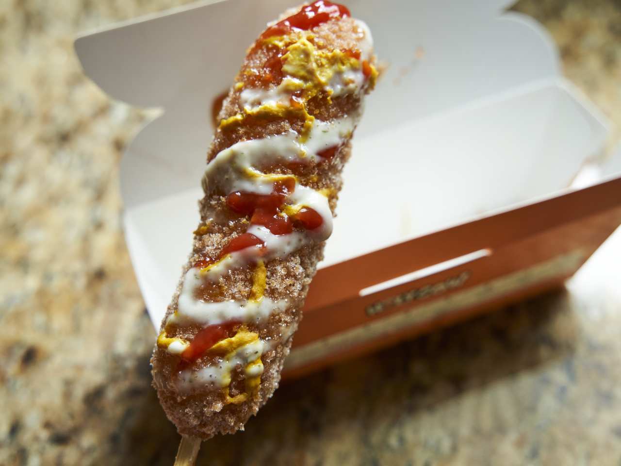 "Mr. Cow Classic The K-Dog is a guilty pleasure of ours. Unlike the traditional American corn dog, the Korean corn dog is a sausage rolled in cheese, dipped in a rice flour batter, rolled in coarse panko, and then lightly coated with sugar after it has been fried—this makes it chewy and crunchy all at once. Mr. Cow’s, in the always busy Cumberland Mall Food Court, is one of our favorite places to grab a K-Dog, especially when we're in the mood for fun toppings like Flaming Cheetos and caramel puff barley. But more often, we're suckers for the traditional—the Mr. Cow Classic with a bit of mustard, ketchup, and ranch. " - lamara davidson