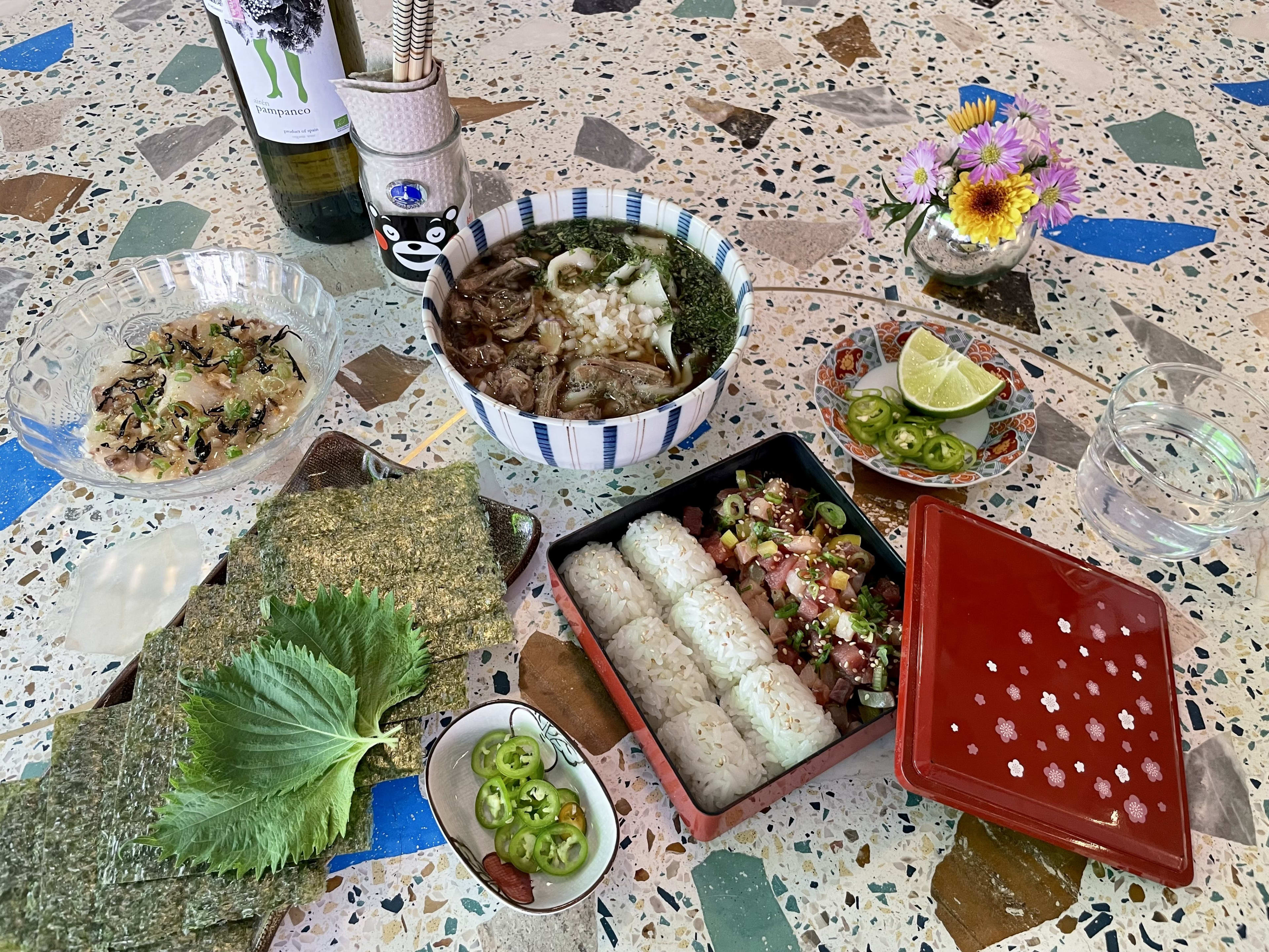 Guava pastry, coffee, salads, pastries in a rustic-chic space