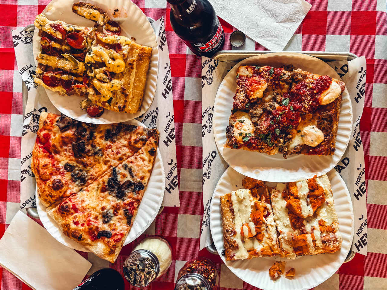"You’d be forgiven for thinking Mortadella Head is a pizza spot for undiscerning college kids: It’s located on College Avenue between Tufts and Lesley, and it sells pizza by the slice. It also has exactly three tables, the music is erratic (we were treated to a medley of Britney Spears, Bad Bunny, and Jewel), and most people wear backpacks. But this is arguably all part of its charm: Mortadella Head has no pretenses—just good pizza. Specifically, Roman-style slices. Square, chewy, and crispy, but a little heartier than the pizza al taglio you’ll find in the Eternal City. Mortadella Head’s also playful with the toppings, which range from classic to newfangled. We dig the Mamaluke, a pie loaded with a happy marriage of crushed meatballs and dollops of ricotta. The Shredder, with pepperoni, sausage, pickled jalapenos, and a squiggle of Calabrian chili aioli, is also great. If you’re craving round pizza a la New York, they nail that, too: a thin layer of fresh, tomato-forward sauce, a speckled layer of cheese, and a thin crust that holds up without being too chewy. Grab a pie to-go, or, if you’re feeling nostalgic for your college days, snag a table and enjoy your pizza on a red and white checkered tablecloth, a shaker of red pepper flakes within reach. And if you’re not in the mood for a slice, they’ve got subs, too." - Grace Kelly