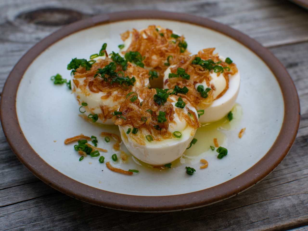 "To say there’s a lot going on at Sonder would be a massive understatement. The dark dining room walls occasionally glow with light from disco balls and taper candles, and an ornate mirror with LED strip lights in the bathroom gives you a full-body view of yourself on the can. It can be a bit overwhelming at times, but you’ll want to stick around for the food. The jammy pickled eggs topped with fried shallots are the perfect little bite, and you’ll find yourself scheduling another trip Upstate just to order the vinegar-marinated roast chicken again. You can’t go wrong with anything on the menu, but if you’re visiting during tomato season and don’t order the tomato vin with garlic cream cheese, you may want to reconsider your life choices." - Anne Cruz