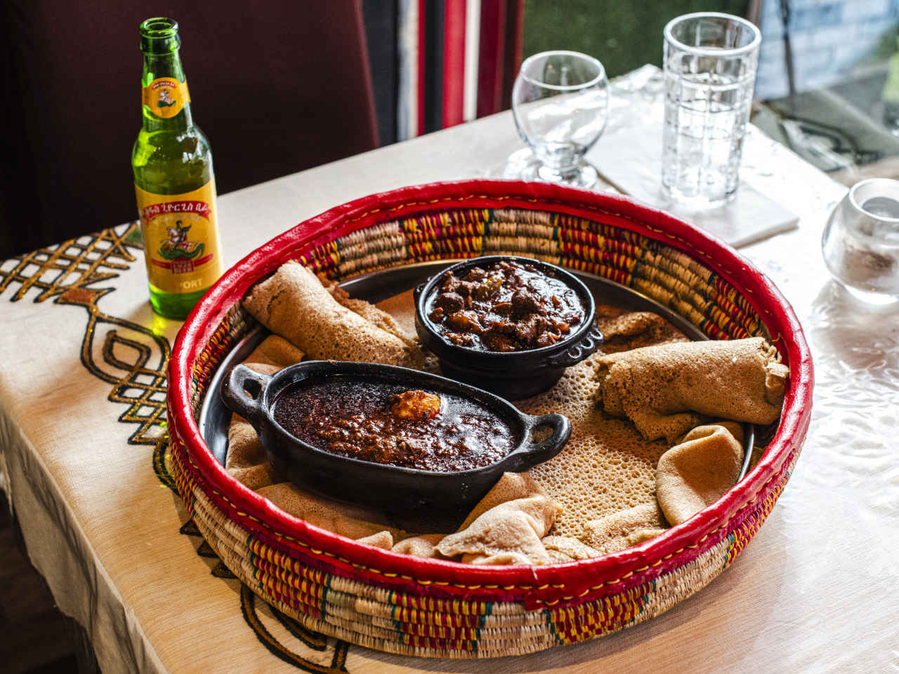 "Merkato’s menu system is not for the faint-hearted. It’s a dizzying grid formation with no less than eight combinations of injera, wot, and tbsi, 24 arrows, and flashbacks for any perennial snakes and ladders loser. Still, pretty much any route you go down will end in button-popping satisfaction. This Ethiopian spot on Caledonian Road is much more straightforward than its ordering style suggests. Mesob baskets with injera and stews come quickly and are piled generously, and every table in the tight-knit, bric-a-brac-filled restaurant is happily tearing and scooping. All of the food is solid. Don’t be surprised to see a birthday celebration happening under the twinkly setting of fairy lights and umbrella chandeliers. A round of crispy St. George lagers and a few communal platters are perfect for a celebration or a long overdue catch-up with all your mates. photo credit: Aleksandra Boruch photo credit: Jake Missing photo credit: Aleksandra Boruch Pause Unmute Food Rundown Vegan Combo With Lamb Tbsi Merkato’s vegan combo comes with a variety of lentil, yellow pea, and spinach stews. There are hits of berbere from the war and nice jolts of ginger too. The lamb tbsi is a little chewier than other varieties but its amaze sauce has a creeping, welcome kick to it. The sauce is a little loose for our liking and the injera is rolled very thin, so you might want some fresh rolls on the side to soak it all up. photo credit: Jake Missing" - Jake Missing